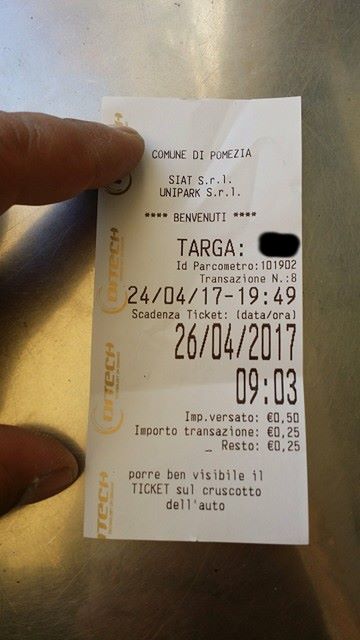 E’ iniziata oggi la seconda fase dei parcheggi a pagamento sul territorio di Pomezia e Torvaianica. Da questa mattina infatti sono attive le nuove strisce blu predisposte su Via Filippo Re, Viale Danimarca e Piazza Italia ma l’avvio non è stato decisamente dei più felici: questo nella foto è infatti uno dei ticket stampati stamane da un cittadino (dal parcometro di Viale Danimarca, ndr) che, anziché riportare l’orario esatto – erano circa le 12 -, ne indica uno a dir poco ‘bislacco’, ovvero le 19.42 di oggi. Non solo: a fronte di un pagamento di 0.25 centesimi, ovvero l’importo dovuto per un quarto d’ora di sosta, la scadenza del ticket è indicata addirittura per le 9.03 del 26 aprile, ovvero ben due giorni di parcheggio con una spesa irrisoria. Un vero affare insomma.