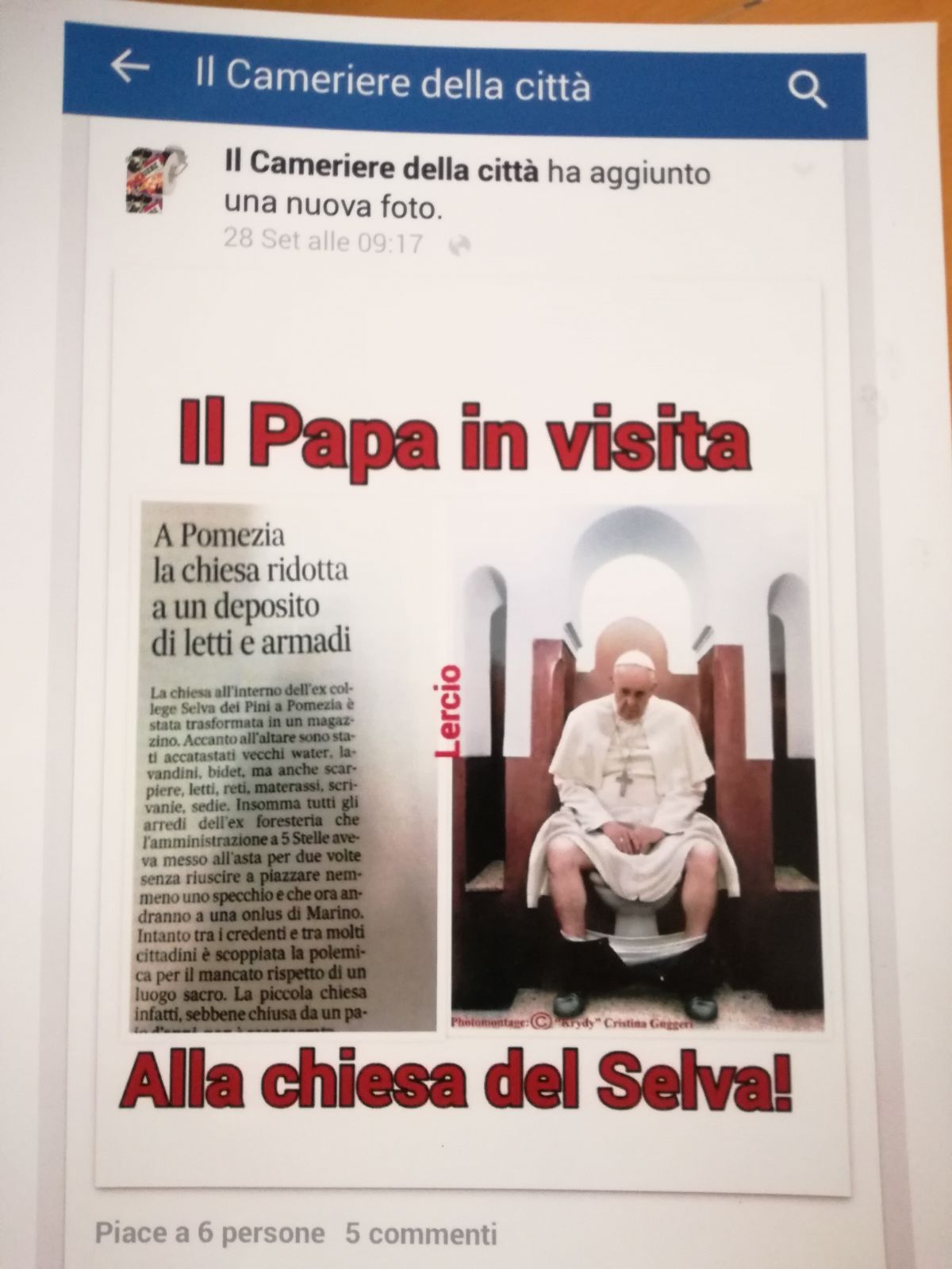 “Le foto successive invece, riguardano una cosa molto grave. Si tratta del gesto fatto dal Sindaco Fabio Fucci, il quale commenta positivamente una foto – chiaramente un fotomontaggio – in cui il Papa, ovvero l’espressione sulla terra più importante per i cattolici, il Capo dello Stato del Vaticano nonché rappresentante di Dio in mezzo a noi, viene palesamene denigrato e Fucci, anziché condannare, commenta con un “like”, apponendo un mi piace nel post in questione (inserito nella pagina Facebook satirica Il Cameriere della Città, ndr)”.