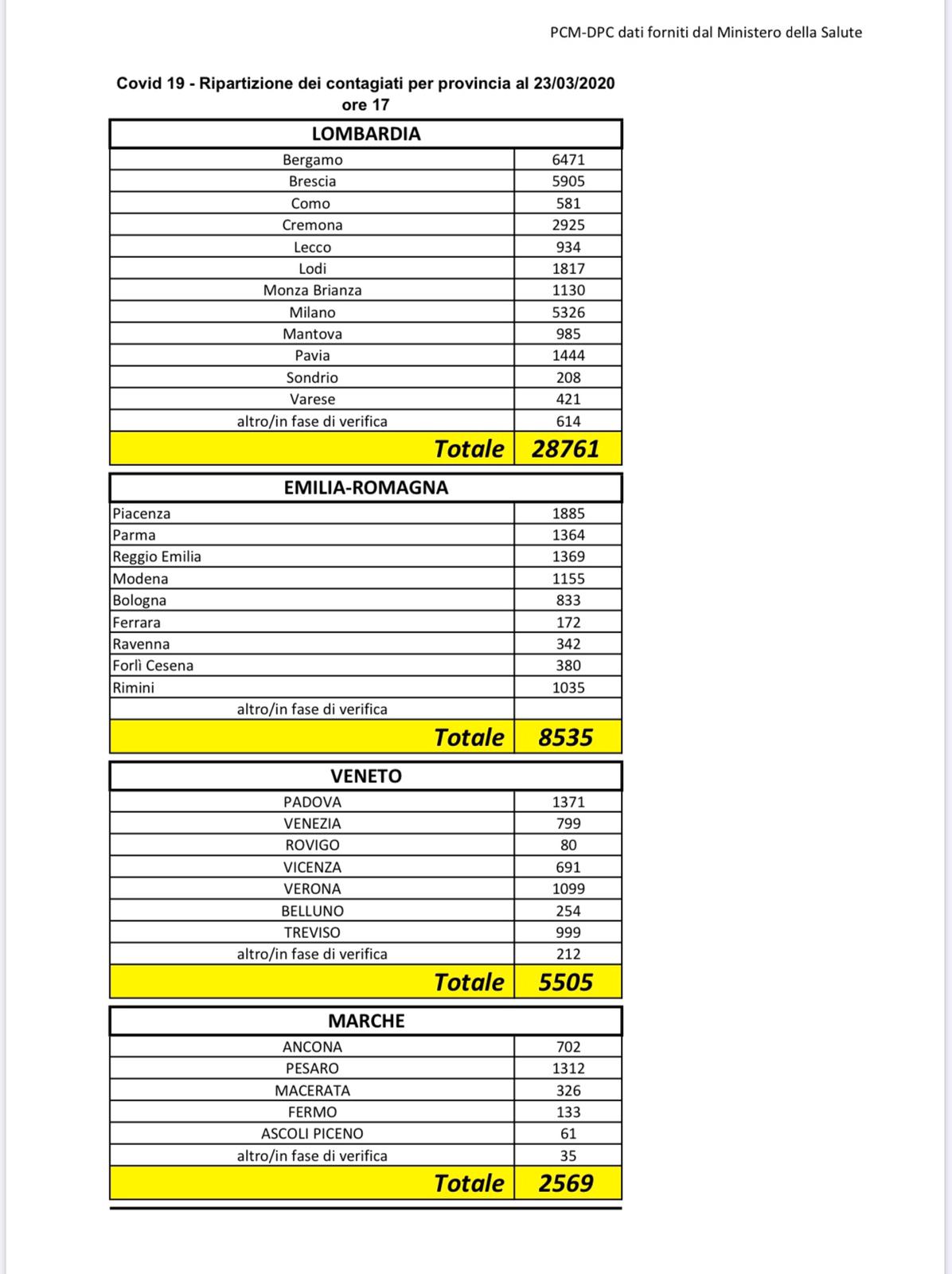 Coronavirus: i dati aggiornati al 23 marzo 2020 e la ripartizione per Regione