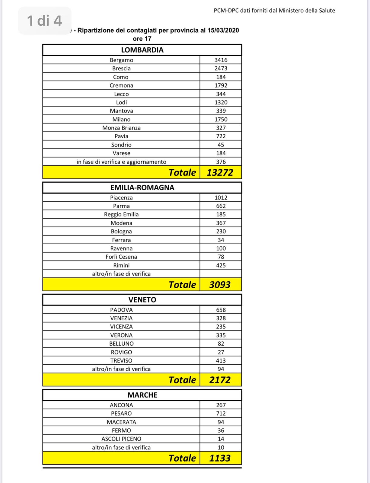 Coronavirus: i dati aggiornati al 15 marzo 2020 e la ripartizione per Regione