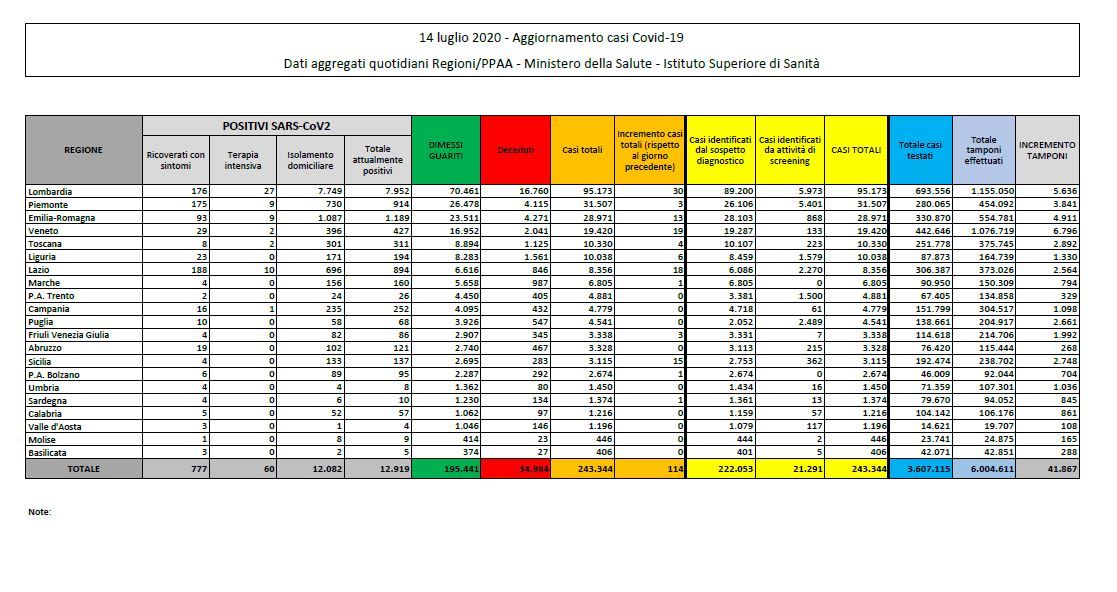 ROMA (ITALPRESS) – Prosegue la discesa dei nuovi casi di coronavirus in Italia. Secondo i dati diramati dal Ministero della Salute, sono 114 i nuovi contagiati (ieri erano 169). Il numero totale dei contagiati sale a 243.433 da inizio pandemia. In aumento i decessi: nelle ultime 24 ore sono stati 17, ieri 13. Ora il numero totale dei morti si avvicina a 35 mila, per l’esattezza il totale delle vittime raggiunge quota 34.984. In crescita i guariti, nelle ultime 24 ore sono stati 335, portando il totale a 195.441. Per quanto riguarda il dato degli attualmente positivi sono 12.919, con un decremento di 238 unità rispetto a ieri. In aumento di 9 i ricoverati: oggi sono 777, 60 dei quali sono in terapia intensiva (5 in meno rispetto a ieri). Infine in calo coloro che si trovano in isolamento: in tutto sono 12.082 -242 rispetto a ieri.