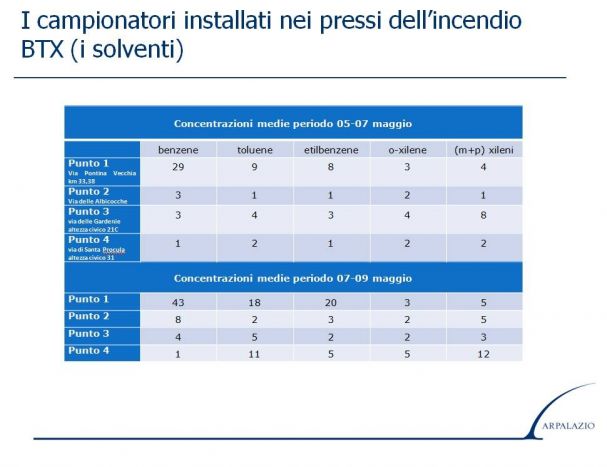 L’andamento, si legge nella relazione consultabile al link http://www.arpalazio.gov.it/download/?sez=eventi&pid=078&fln=Incendio_Pomezia_Relazione_16-5-2017_inquinanti-vari.pdf, sembra essere di costante diminuzione dei valori inquinanti, anche se ci sono ancora valori elevati di microinquinanti organici (tra cui la diossina).