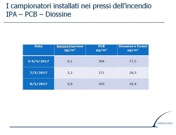L’andamento, si legge nella relazione consultabile al link http://www.arpalazio.gov.it/download/?sez=eventi&pid=078&fln=Incendio_Pomezia_Relazione_16-5-2017_inquinanti-vari.pdf, sembra essere di costante diminuzione dei valori inquinanti, anche se ci sono ancora valori elevati di microinquinanti organici (tra cui la diossina).