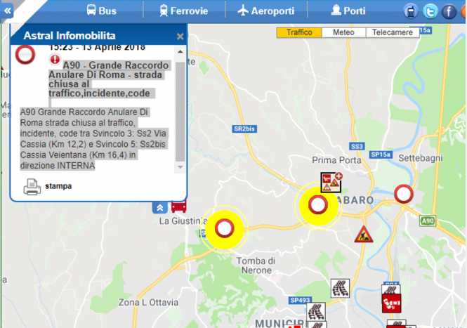 Anas comunica che sul Grande Raccordo Anulare di Roma il traffico è temporaneamente bloccato a causa di un incidente in prossimità delle uscite “SS2bis Cassia Veientana/Viterbo” e “Ospedale Sant’Andrea” (km 16,500) in carreggiata esterna. Alle 15:00 il traffico è stato temporaneamente interrotto in entrambe le carreggiate (ora riaperte come visto, ndr) per consentire l’intervento dell’eliambulanza