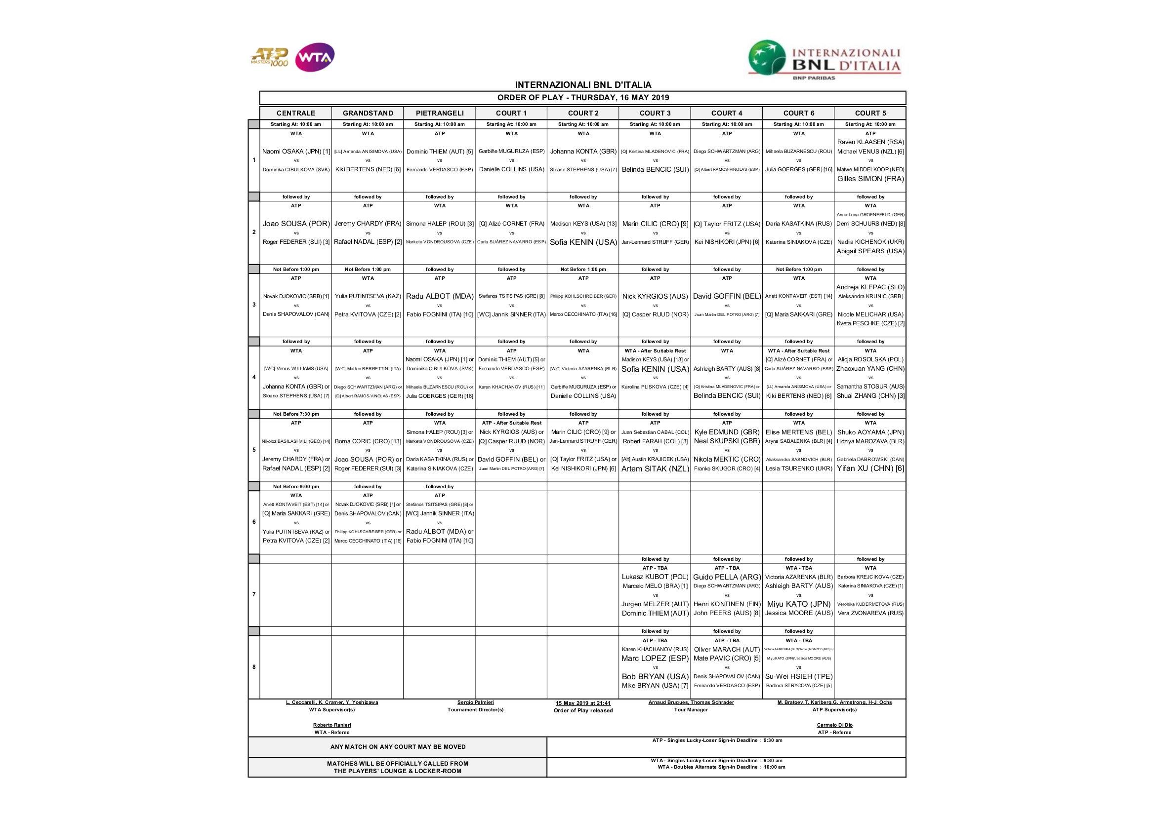 Giocherà sul Pietrangeli invece Fabio Fognini impegnato contro Radu Albot (terzo incontro in programma). Qui, a pomeriggio inoltrato/serata, potenziale duello tutto azzurro dato che se Fognini passerà il turno affronterà uno tra l’azzurro Jannik Sinner e – eventualità questa decisamente più probabile – il greco Tsitsipas (finalista a Madrid) in programma sul Court 1 come terzo incontro. Marco Cecchinato è, infine, in programma sul Court 2 come terzo incontro ma con inizio non prima delle 13.