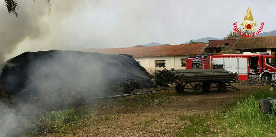 Le fiamme si sono sviluppate alla di alcuni copertoni utilizzati per ancorare dei teli che coprivano un cumulo di foraggio.