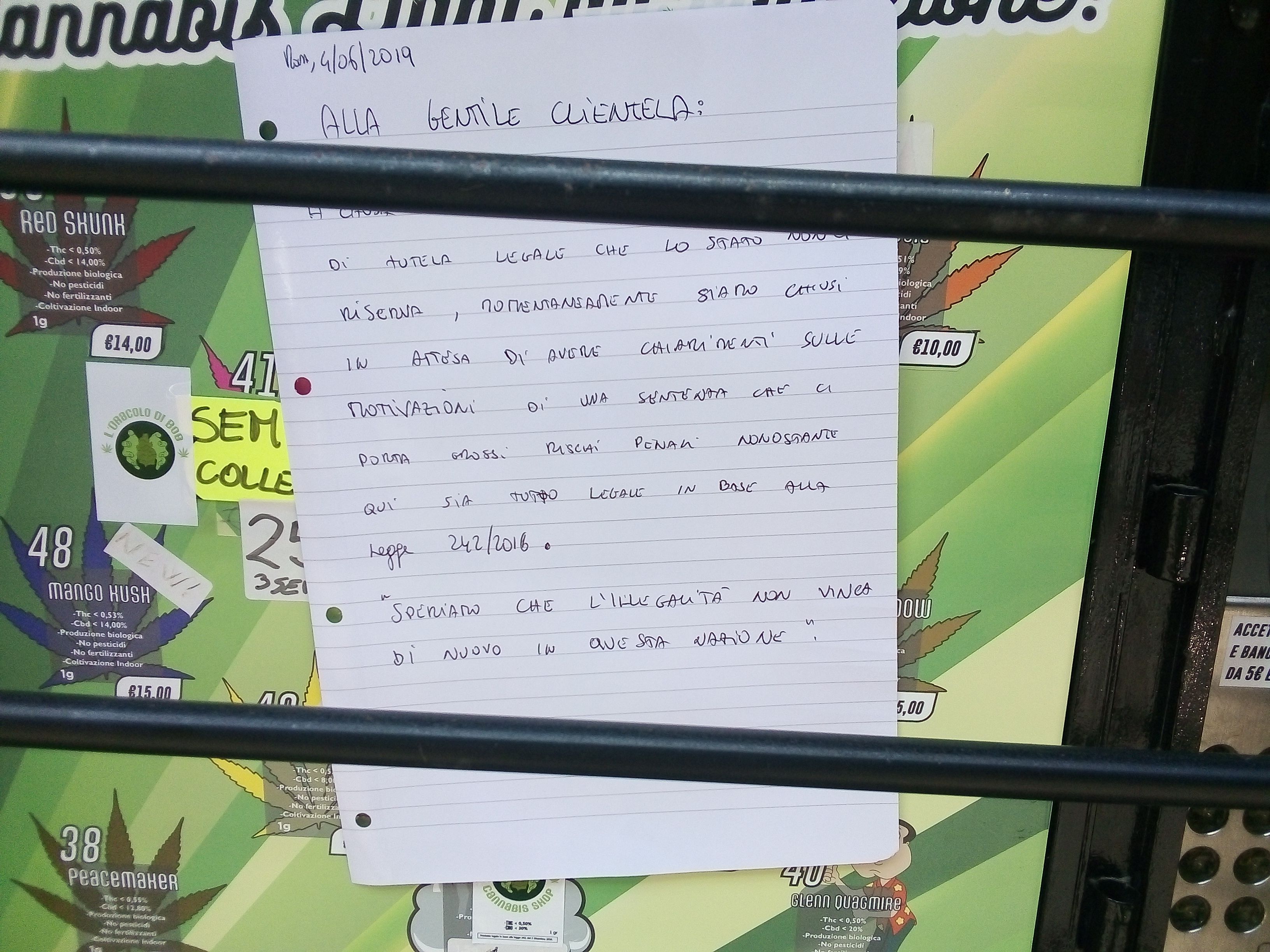 Una buona fetta di negozi, addirittura, ha chiuso di propria volontà in attesa di capire meglio gli sviluppi dell’intera vicenda, magari con la pubblicazione delle motivazioni della sentenza della Suprema Corte del 30 maggio scorso: “Noi abbiamo addirittura abbassato le saracinesche, ci prendiamo una vacanza forzata per qualche giorno, non vogliamo problemi” ci dicono i titolari dello Shock House. E ancora: “L’avvocato ci ha consigliato di chiudere precauzionalmente” raccontano dal Druido Hemp Shop che non è l’unica attività ad aver consultato i propri legali.