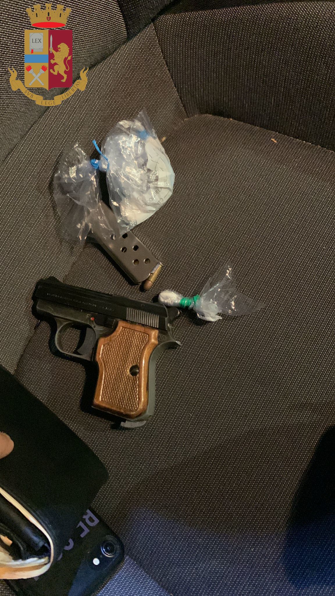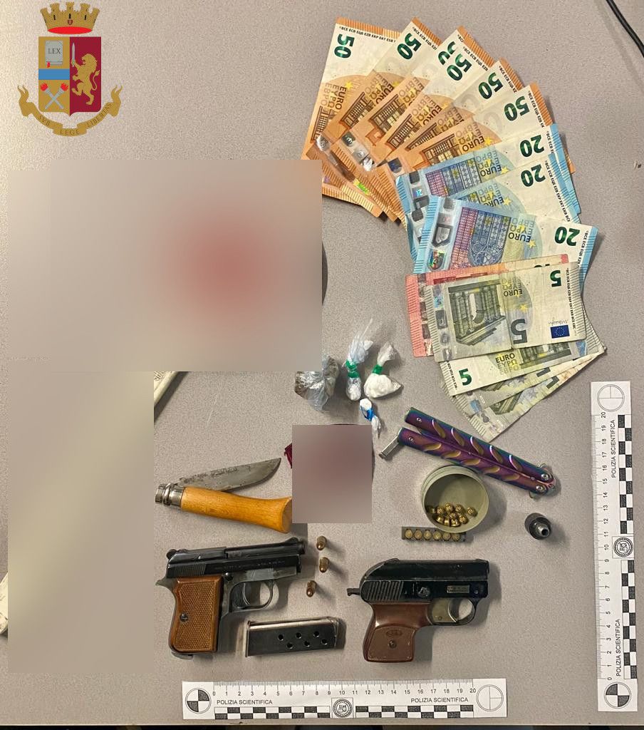Durante le comnsute attività di controllo del territorio, gli agenti hanno notato un’auto provenire da Via dell’Acqua Marcia a forte velocità e poi, alla loro vista, rallentare bruscamente per poi svoltare su Via Silvano. Fermato il veicolo per un controllo, il 42enne sin da subito ha manifestato un eccessivo stato di agitazione. La perquisizione personale ha permesso di rinvenire all’interno della tasca destra del giubbotto due coltelli, uno con manico in legno e lama sporca di sostanza stupefacente del tipo hashish e l’altro a farfalla, grigio cromato mentre all’interno del marsupio che aveva a tracolla, in una fodera bianca, è stata trovata una pistola semiautomatica cal. 6.35 con matricola abrasa e caricatore inserito rifornito con 3 proiettili dello stesso calibro, oltre a denaro contante pari a 390,00 euro. All’interno degli slip, invece, sono stati rinvenuti involucri di sostanza stupefacente del tipo hashish, cocaina e pasticche MDMA. Durante la perquisizione domiciliare invece è stata rinvenuta altra sostanza stupefacente del tipo hashish e una pistola lanciarazzi cal.22 con relativo tromboncino, caricatore inserito e rifornito di 6 colpi a salve oltre ad una scatolina metallica contenente ulteriori 10 colpi. La sostanza stupefacente rinvenuta pari a 2,6 grammi di cocaina, 13,5 grammi di hashish, 0.5 grammi lordi di MDMA unitamente al denaro, i coltelli e le due pistole è stata sottoposta a sequestro.