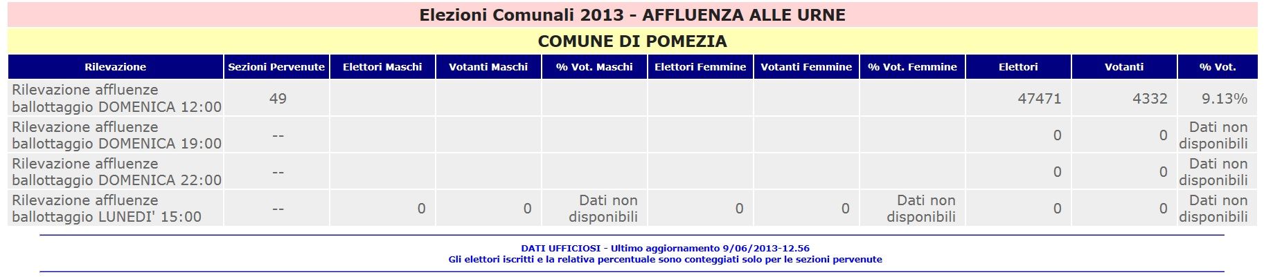 Sempre più bassa l’affluenza per questo ballottaggio che deciderà chi sarà il nuovo sindaco di Pomezia. Alle 19:00 avevano votato solo il 25,3% degli aventi diritto, pari a 12011 persone, contro le 16453 (34.66%) del primo turno. Facendo i confronti con Roma, vediamo che nella capitale alle ore 19:00 l’affluenza dei votanti è del 23,49%, in flessione rispetto al 29,79% del primo turno, quindi una percentuale ancora più bassa che a Pomezia. Alle ore 12:00 l’affluenza dei votanti a Roma era pari all’8,26%, in flessione rispetto al 9,32 del primo turno. Prossimo aggiornamento alle ore 22:00