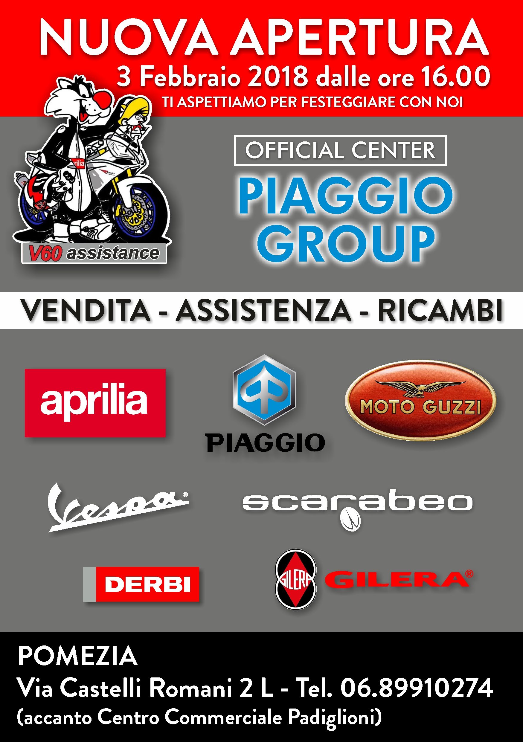 Inaugurazione Sabato 3 febbraio 2018 a Pomezia. Apre al pubblico il nuovo negozio Aprilia V60 Assistance dedicato interamente al mondo delle due ruote; il locale, Official Center Piaggio Group, fornirà vendita, assistenza e ricambi delle miglior marche tra cui Aprilia, Piaggio, Moto Guzzi, Vespa, Scarabeo, Derbi e Gilera.