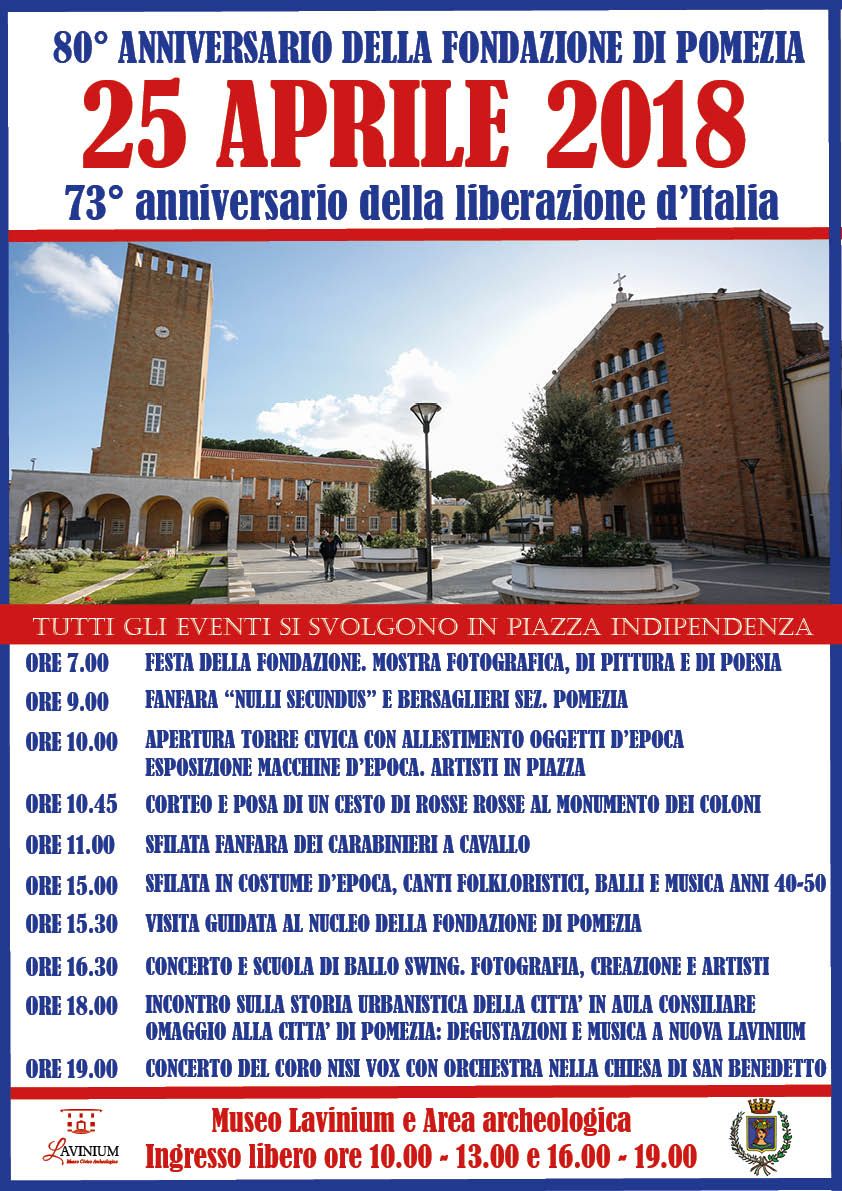 Pomezia celebra il 25 aprile: 80° Anniversario della Fondazione e 73° Anniversario della liberazione d’Italia. Di seguito il programma completo dei festeggiamenti.