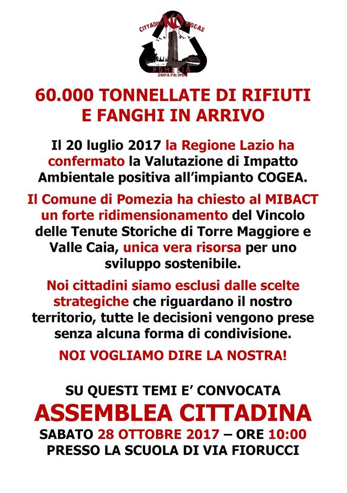 Tornano a far sentire la propria voce i cittadini di Pomezia, ed in particolare quelli del quadrante di Roma 2 – Santa Palomba. Il tema dell’assemblea – indetta per sabato prossimo – è sempre quello dell’impianto Cogea: “Noi siamo stati esclusi dalle scelte strategiche per la città“, recita il volantino che annuncia l’indizione della manifestazione. Promotore dell’iniziativa il gruppo No Biogas Pomezia. Sarà presente inoltre anche l’associazione Latium Vetus.