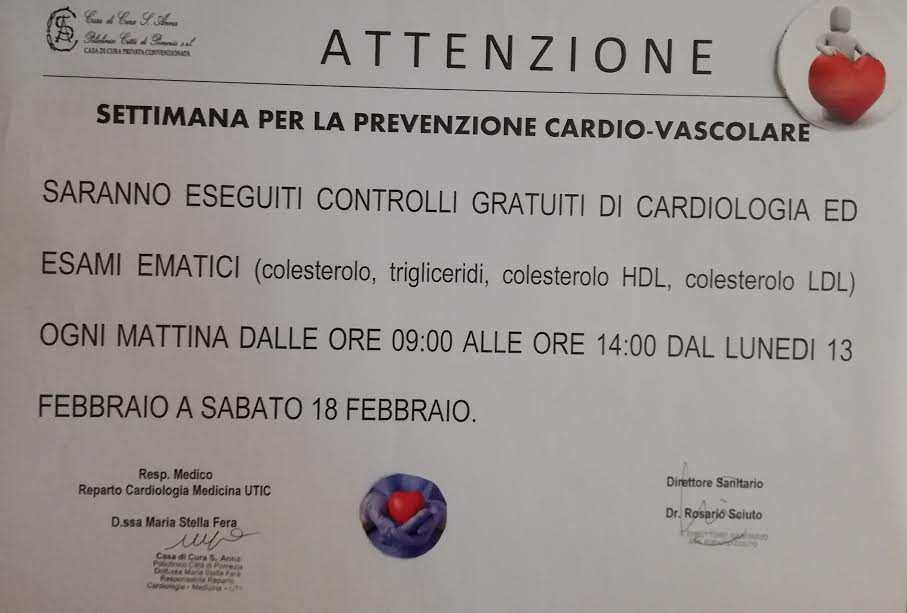 Per effettuare i controlli – fa sapere il Resp. Medico Reparto Cardiologia Medicina UTIC, la Dott.ssa Maria Stella Fera, sarà sufficiente recarsi nella struttura e chiedere della sig.ra Cappelli, incaricata di stilare un elenco e registrare i pazienti. Le visite, nelle modalità di cui sopra, saranno effettuate da lunedì 13 febbraio a sabato 18 febbraio nella fascia oraria 9-14. Si consiglia, per chi ne ha la possibilità, di portare referti o esami precedentemente svolti per avere una maggiore completezza di informazioni.