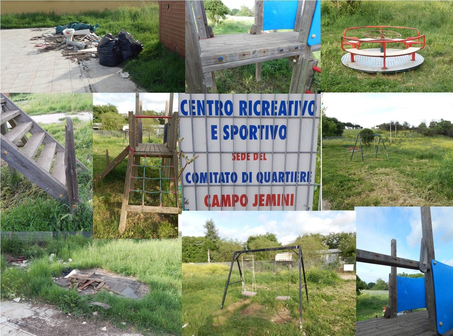 Passeggiando in famiglia per la vie di Campo Jemini, mi sono trovato di fronte al parco sito in via dei Fiordalisi; mia figlia è subito felicemente corsa al suo interno con l’intento di giocare vista la presenza di alcuni giochi ma il suo desiderio purtroppo non si è avverato visto lo stato di abbandono