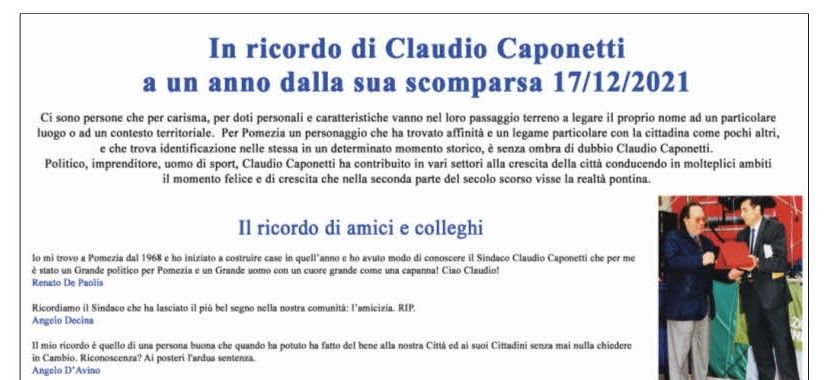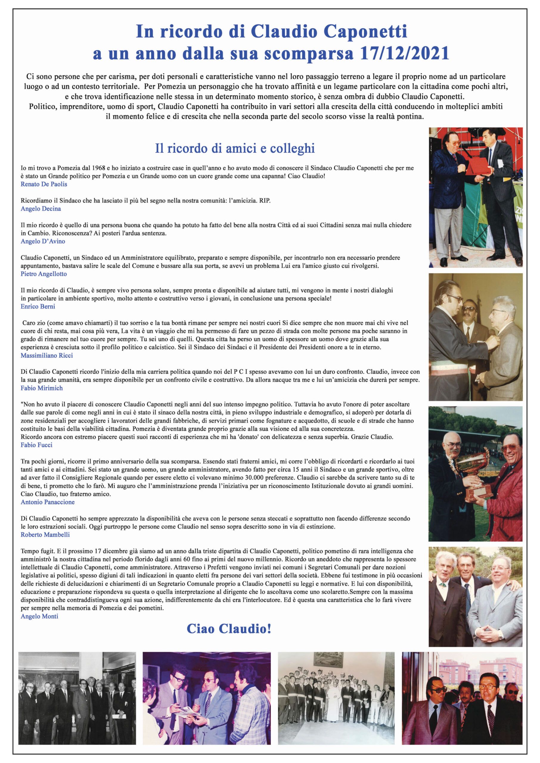 Il ricordo di Claudio Caponetti, ex Sindaco di Pomezia per ben due volte, a un anno dalla sua scomparsa. Caponetti, imprenditore, politico ma anche uomo di sport, ha guidato l’amministrazione comunale la prima volta tra il 1966 e il 1978, per poi essere rieletto, con una breve parentesi, nel periodo tra il 1983 e il 1985. Aveva 83 anni. I suoi ultimi impegni politici nel 2018, come referente locale della Democrazia Cristiana. Lo scorso anno, purtroppo, è venuto a mancare.