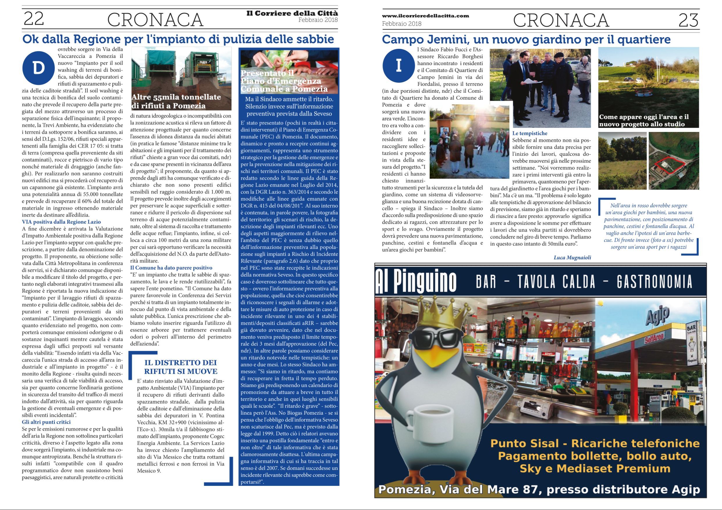 A fine dicembre è arrivata la Valutazione d’Impatto Ambientale positiva dalla Regione Lazio per l’impianto seppur con qualche prescrizione, a partire dalla denominazione del progetto. Il proponente, su obiezione sollevata dalla Città Metropolitana in conferenza di servizi, si è dichiarato comunque disponibile a modificare il titolo del progetto, e pertanto negli elaborati integrativi trasmessi alla Regione è riportata la nuova indicazione di “Impianto per il lavaggio rifiuti di spazzamento e pulizia delle caditoie, sabbia dei depuratori e terreni provenienti da siti contaminati”.