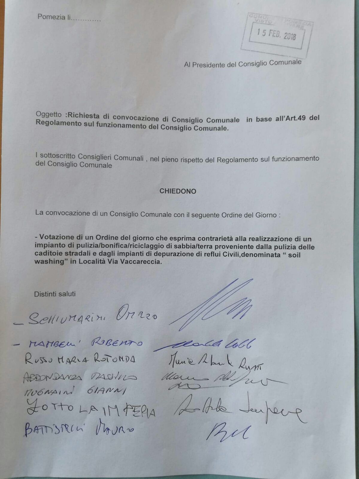 Eloquente il punto all’ordine del giorno richiesto: “Votazione di un ODG che esprima contrarietà alla realizzazione di un impianto di pulizia/bonifica/riciclaggio di sabbia/terra proveniente dalla pulizia delle caditoie stradali e dagli impianti di depurazione reflui civili denominata Soil Washing in Via Vaccareccia”.