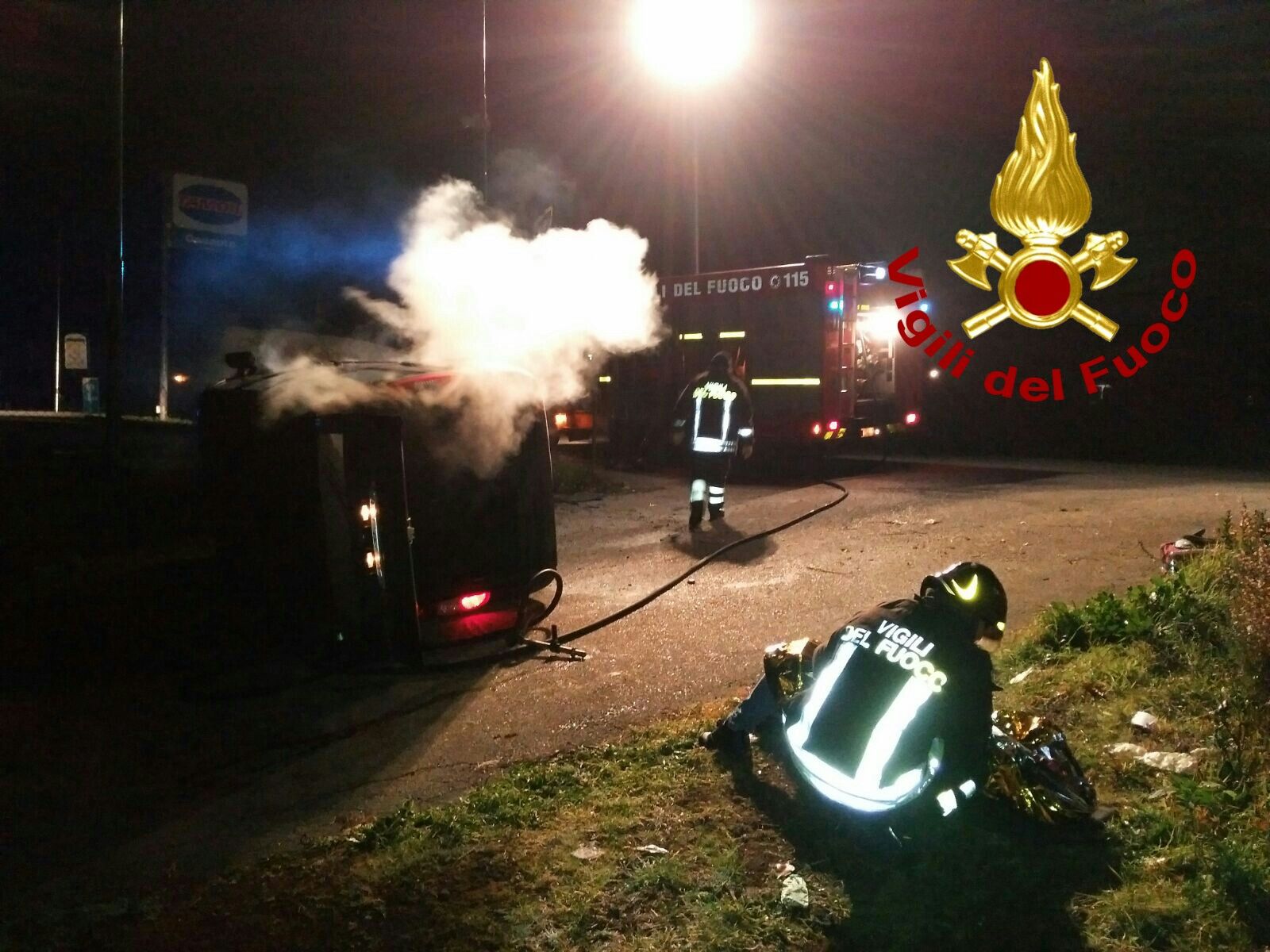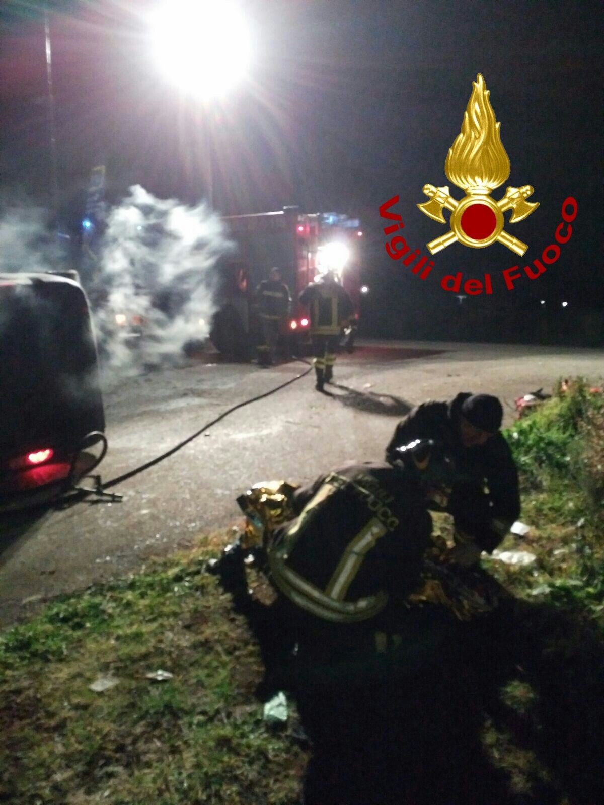 La squadra dei vigili del fuoco ha estratto dall’auto in fiamme, che era alimentata a GPL, il conducente, un ragazzo di 26 anni, salvandogli la vita.