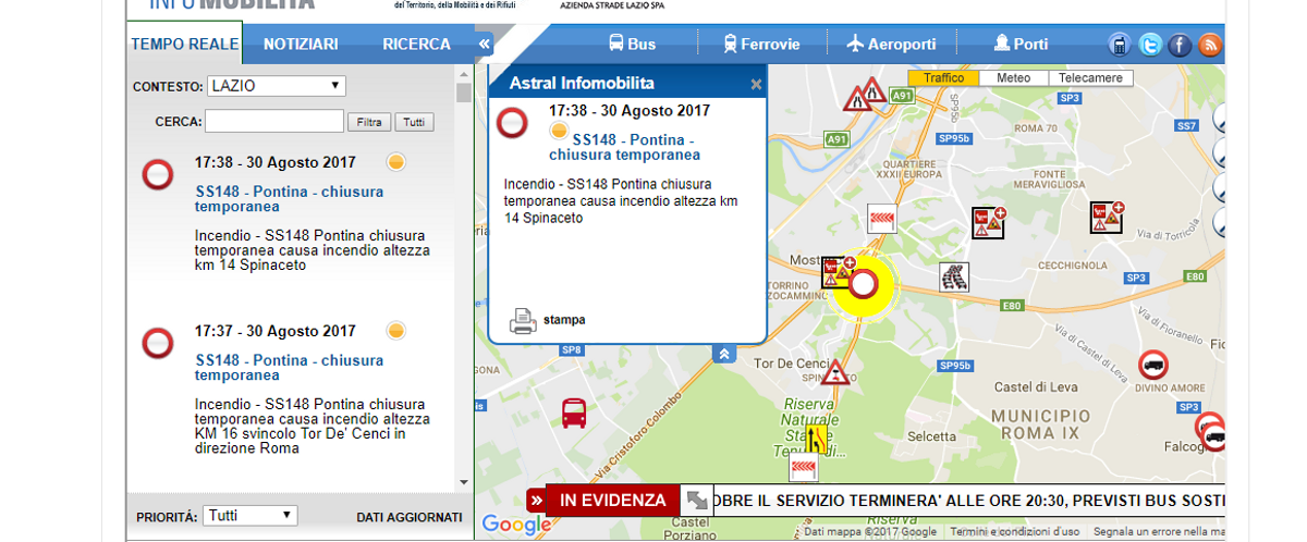 La SS148 Pontina era stata chiusa temporaneamente al traffico causa incendio nei minuti scorsi. La strada era stata interdetta al traffico all’altezza del KM 16, in corrispondenza dello svincolo di Tor De’ Cenci in direzione Roma, per diversi minuti, prima di essere riaperta parzialmente. Al momento infatti si circola su un’unica corsia, come riporta Astral. Il traffico, come era prevedibile, è andato completamente in tilt. Lunghissime code si registrano infatti sulla carreggiata, in particolare code tra lo Svincolo Monte D’oro e lo Svincolo Tor De’ Cenci in direzione Roma altezza Km 16+400 circa.