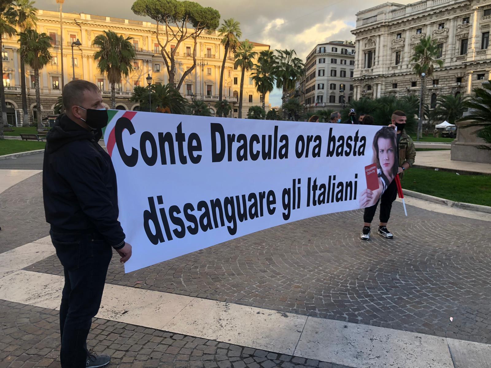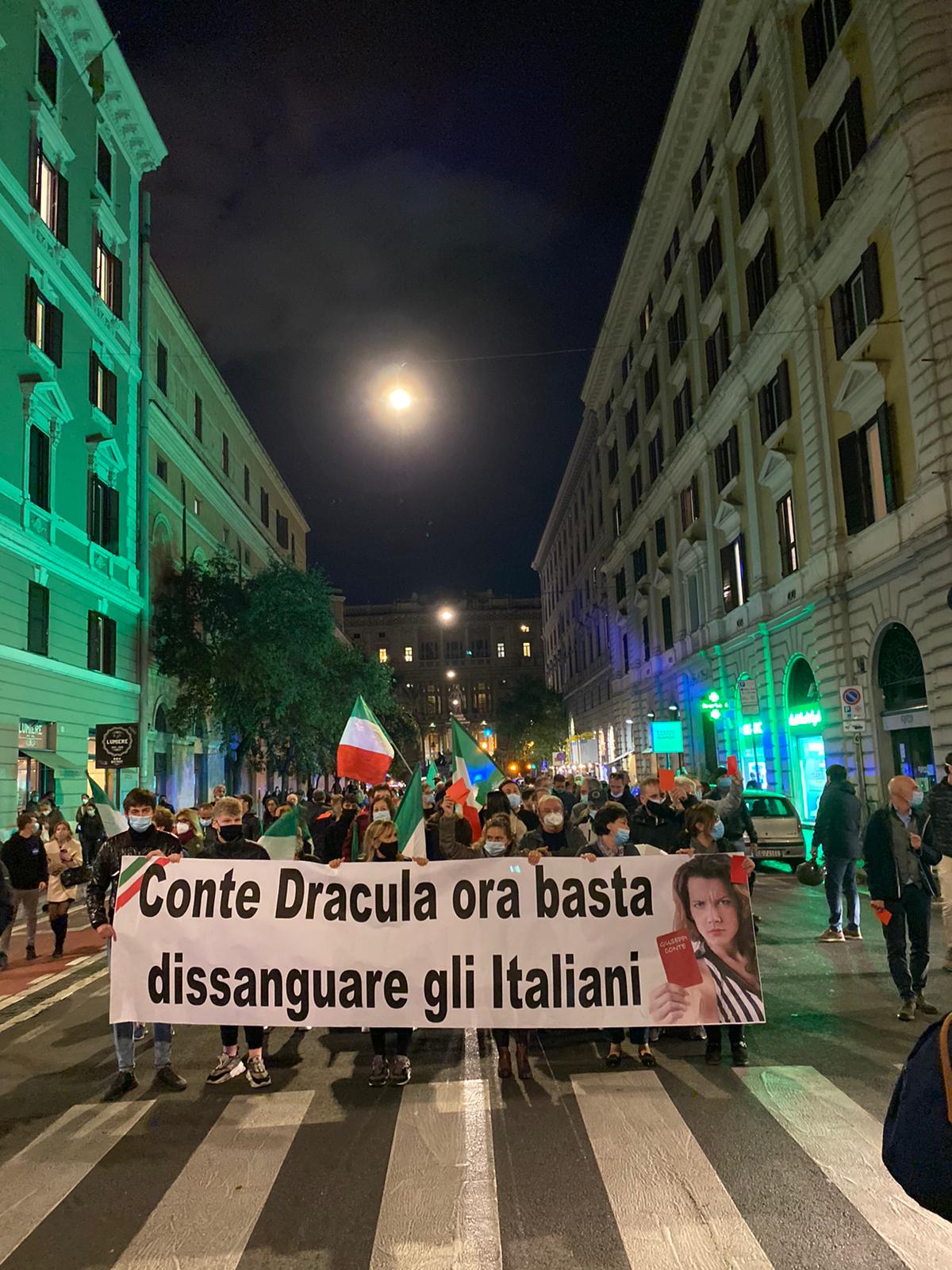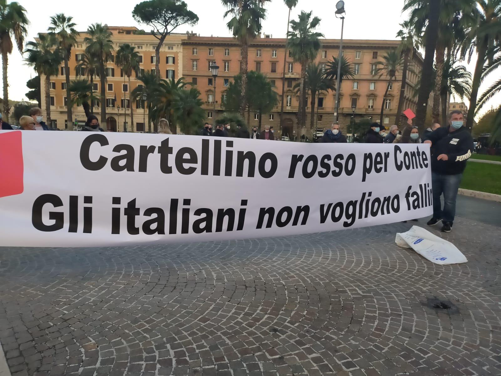 “Cartellino rosso per Conte. Gli italiani non vogliono fallire” e ancora “Conte Dracula, ora basta dissanguare gli italiani” sono questi due dei tanti striscioni che i commercianti scesi in piazza Cavour oggi pomeriggio dalle 18 hanno esposto. Continuano anche nella Capitale le proteste pacifiche e spontanee, perché le restrizioni contenute nell’ultimo decreto non stanno facendo altro che piegare economicamente categorie già in estrema difficoltà. Gli italiani non vogliono fallire, non vogliono abbassare per sempre le saracinesche delle attività.