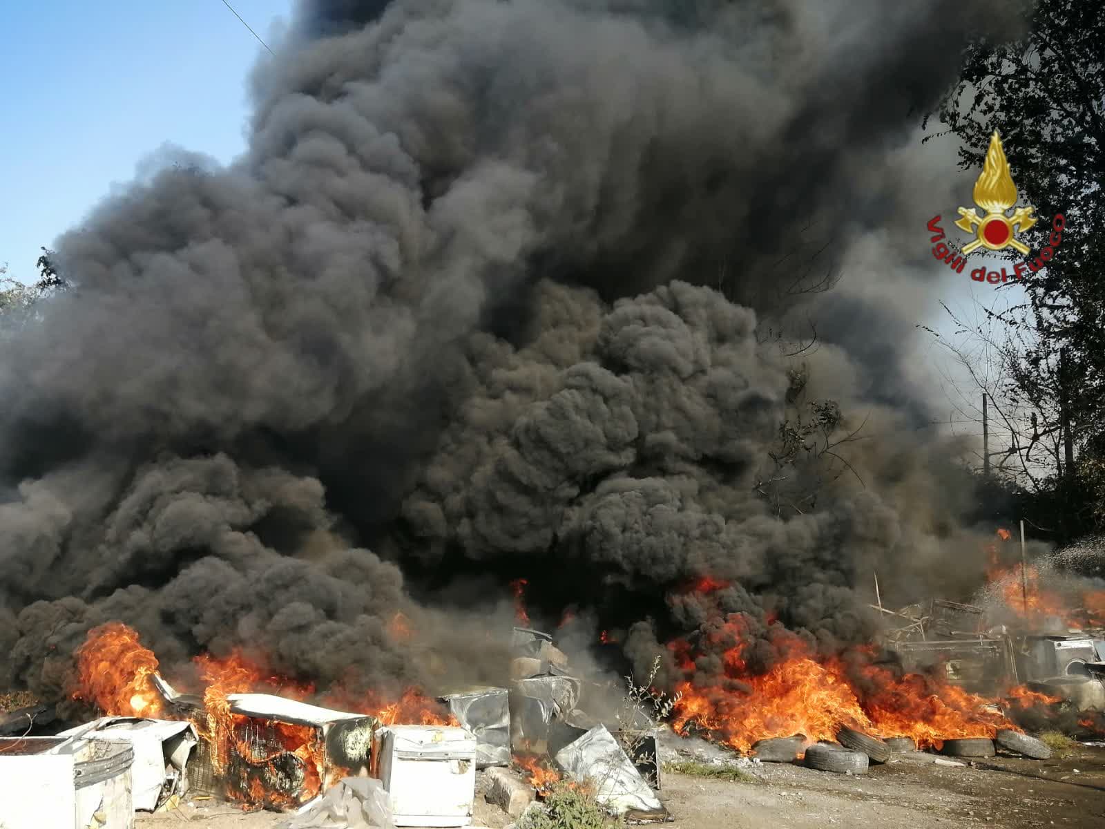 L’enorme colonna di fumo nero è visibile anche a molti chilometri di distanza e l’aria è irrespirabile. Nessuna persona, struttura abitativa e/o industriale è rimasta coinvolta. Sul posto i Vigili del fuoco e un’autobotte.