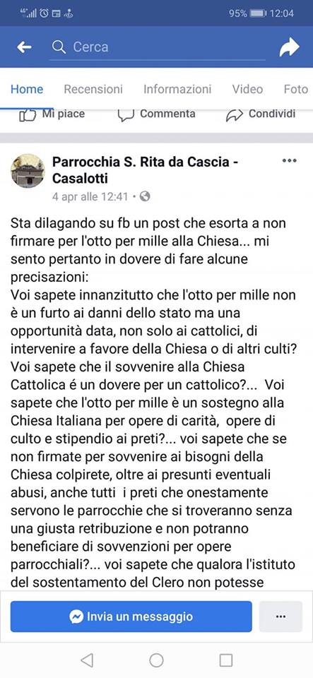 Una vicenda che lascia perplessi e che fa mettere in dubbio anche i motivi dietro la scelta di intraprendere una vita ecclesiastica. Un parroco romano, utilizzando la pagina Facebook ufficiale della sua Chiesa, ha pubblicato un post indirizzato a chi non versa l’otto per mille alla Chiesa Cattolica. Il post in questione ha scatenato l’ira e lo sdegno di molti parrocchiani e non.