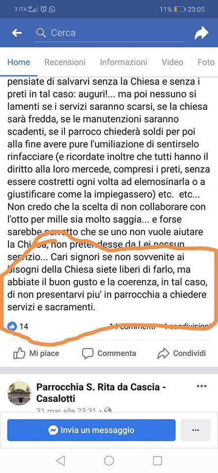 Il prete ha continuato scrivendo che, nel caso in cui i “buoni cattolici” non donassero più il loro otto per mille alla Chiesa, ci sarebbero dei problemi a livello di stipendio per i preti. Il problema principale quindi non sarebbe sfamare la povera gente o fare opere di bene, ma più che altro sovvenzionare la parrocchia e pagare gli stipendi. Il parroco ha infine invitato a non richiedere alcun sacramento se non si dona. Ma i sacramenti non vengono comunque già pagati visto che per poterne usufruire viene richiesta una quota a tariffa “più o meno” libera?