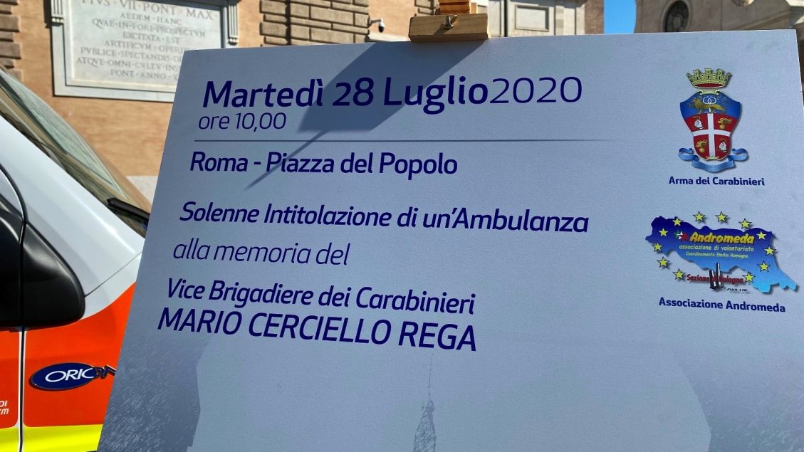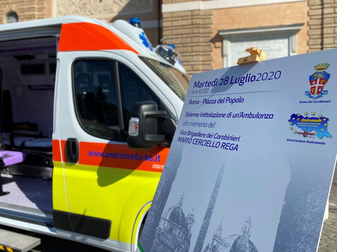 Il 28 luglio 2020 alle ore 10.00, in Piazza del Popolo, nell’area antistante al Comando Legione Carabinieri Lazio, si è svolta la cerimonia di intitolazione di un’ambulanza da parte dell’Associazione di Volontariato “Andromeda” di Bologna alla memoria del Vice Brigadiere dei Carabinieri Mario Cerciello Rega, proditoriamente ucciso il 26 luglio 2019, nell’affrontare due malviventi responsabili di estorsione, attinto mortalmente da 11 coltellate.