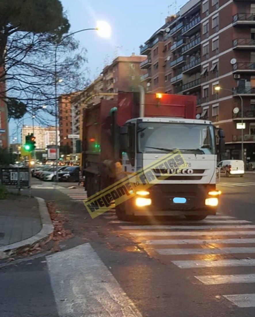 Indigna la foto di un operaio dell’Ama che dovrebbe essere a lavoro, ma che non solo scende a comprare forse un giornale, ma “parcheggia” il compattatore sulle strisce pedonali.