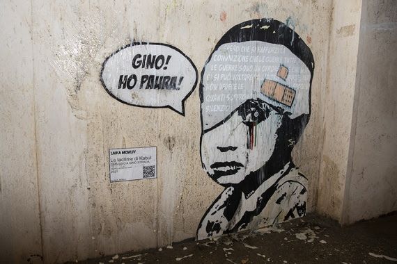 Un bambino afghano con delle bende sulla testa e sull’occhio destro che si rivolge a Gino Strada: “ho paura”. Questa è l’immagina che è apparsa nella notte del 15 Agosto, a Roma, in via Andrea Provana, all’angolo di via Biancamano. L’opera della Street Artist Laika, si intitola “Le Lacrime di Kabul (Omaggio a Gino Strada)”.