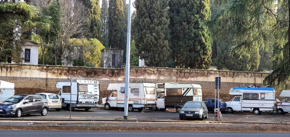 Roma, cimitero Verano: presso il parcheggio del camposanto una folta schiera di camper si manifesta in tutto il suo spendore, si fa per dire ovviamente. Un vero e proprio camping quello che si si verifica nelle immediate adiacenze del cimitero comunale che per nulla si addice alla sacralità del luogo. Si riportano di seguito le foto a testimonianza dell’indecorosa situazione.