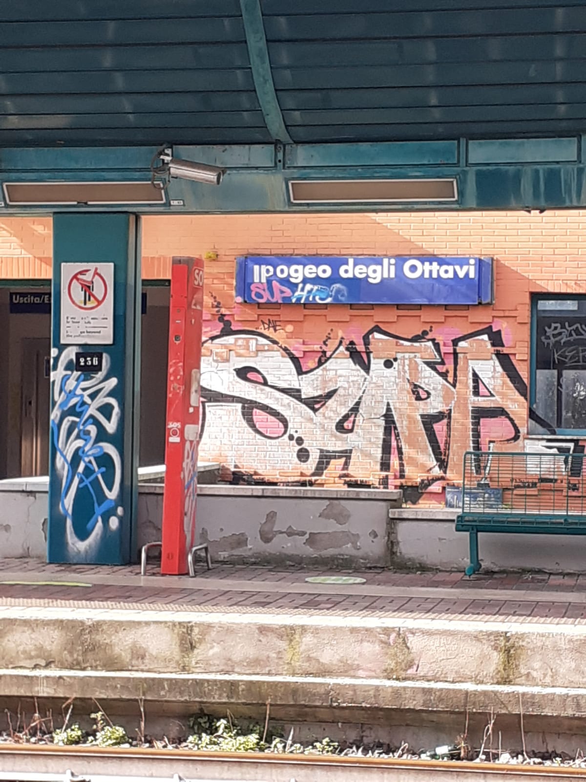 La settimana scorsa sono arrivati i Carabinieri, allertati da una mamma, che li ha sorpresi a vandalizzare una panchina e a scarabocchiare sui muri. “questa stazione era un fiore all’occhiello – dichiara la signora inviperita a Ipogeo degli Ottavi. Prima che riaprissero le scuole era un salotto, in confronto a tante altre stazioni romane! Se ogni tanto compariva un graffito, la cooperativa di pulizia, dopo aver lavato a specchio pavimenti e finestre, passava anche una mano di vernice su quelle scritte. Ma ora… ora è impossibile!” E invero non c’è muro, impianto o macchinetta che non sia stato deturpato da scritte e disegni. Talvolta osceni, talvolta persino blasfemi. Anche i vetri delle finestre sono stati spaccati e ascensore e scale mobili, tutti imbrattati anche quelli, funzionano a giorni alterni. Dalle quattro alle sei del pomeriggio altri treni, altri vagoni rigurgitano il fiume in piena degli studenti che rientrano dalle scuole. Molti di loro non rientrano subito. E con il resto della banda si fermano per rollarsi altre