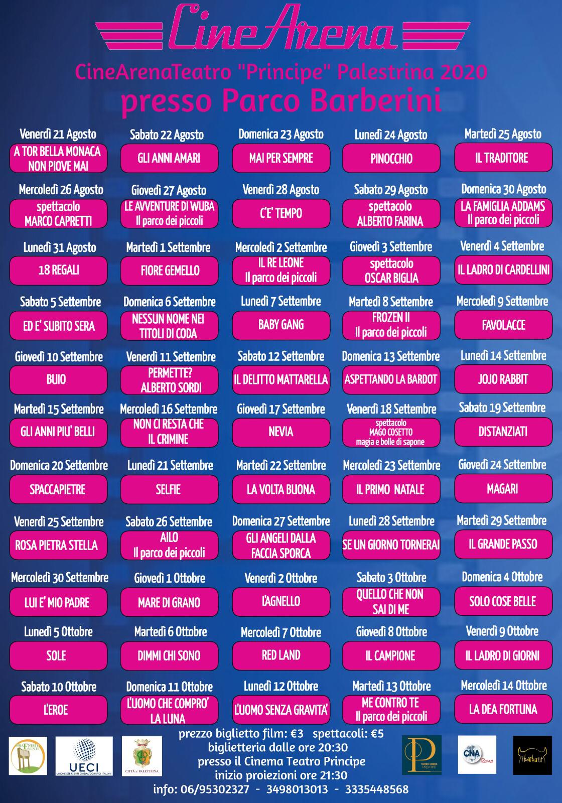 Al via la grande arena nella suggestiva location di Palestrina, città della Dea Fortuna alle porte di Roma: oltre quaranta pellicole italiane, 8 film di animazione dedicati ai bambini e quattro spettacoli comici. Il CineArena è attivo per tutti gli spettatori, nel verde di Parco Barberini fino a fine settembre e poi con proseguimento al cinema-teatro Principe. Ogni sera il pubblico potrà trovare all’interno della programmazione, eventi speciali, con la presenza di registi e parte del cast nel rispetto della normativa vigente anti Covid-19.