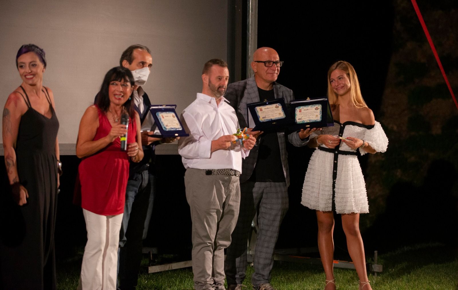 Grande successo nella suggestiva cornice di Villa Fidelia che si è trasformata in una sala cinematografica all’aperto portando l’emozione del grande schermo sotto il cielo stellato di Spello. Giunta al terzo anno consecutivo “Cinema sotto le stelle della commedia e del cinema italiano” la kermesse, promossa dall’Associazione Amici di Spello in collaborazione con RomArteventi e con il patrocinio della Provincia di Perugia ed il Comune di Spello, che accanto alla proiezione di film ha riproposto, con l’accoglienza calorosa del pubblico, l’incontro con i registi e parte del cast, un viaggio alla scoperta di approfondimenti e curiosità. Gli appuntamenti, che rientrano nella programmazione di Incontri per le Strade, quest’anno si sono svolti in una location d’eccezione immersa nel verde che ha rispettato le norme delle attuali normative di sicurezza. Proiettati e premiati “UP& D0WN- un film normale”, il film diretto da Paolo Ruffini e Francesco Pacini che mostra un volto inedito della disabilità, attraverso gli occhi di cinque attori con Sindrome di Down e uno autistico di una compagnia teatrale itinerante che tentano di inseguire il proprio sogno di solcare i palchi di tutta Italia. Calorosa accoglienza per Lamberto Giannini, Direttore artistico e regista della compagnia Mayor Von Frinzius della compagnia teatrale composta da 90 attori, la metà dei quali disabili, presenti anche i bravi e giovani attori Irene Morini e Federico Parlanti che hanno ricevuto i premi ed emozionati hanno risposto alle domande e curiosità del pubblico. Premiato anche il film “SCONNESSI” regia di Christian Marazziti che ha salutato il folto pubblico presente, racconta le vicende dei componenti di una famiglia allargata che si ritrovano isolati in uno chalet di montagna senza connessione internet e devono affrontare una situazione complicata dopo l’altra, tentando di confrontarsi faccia a faccia senza l’aiuto degli ausili tecnologici.