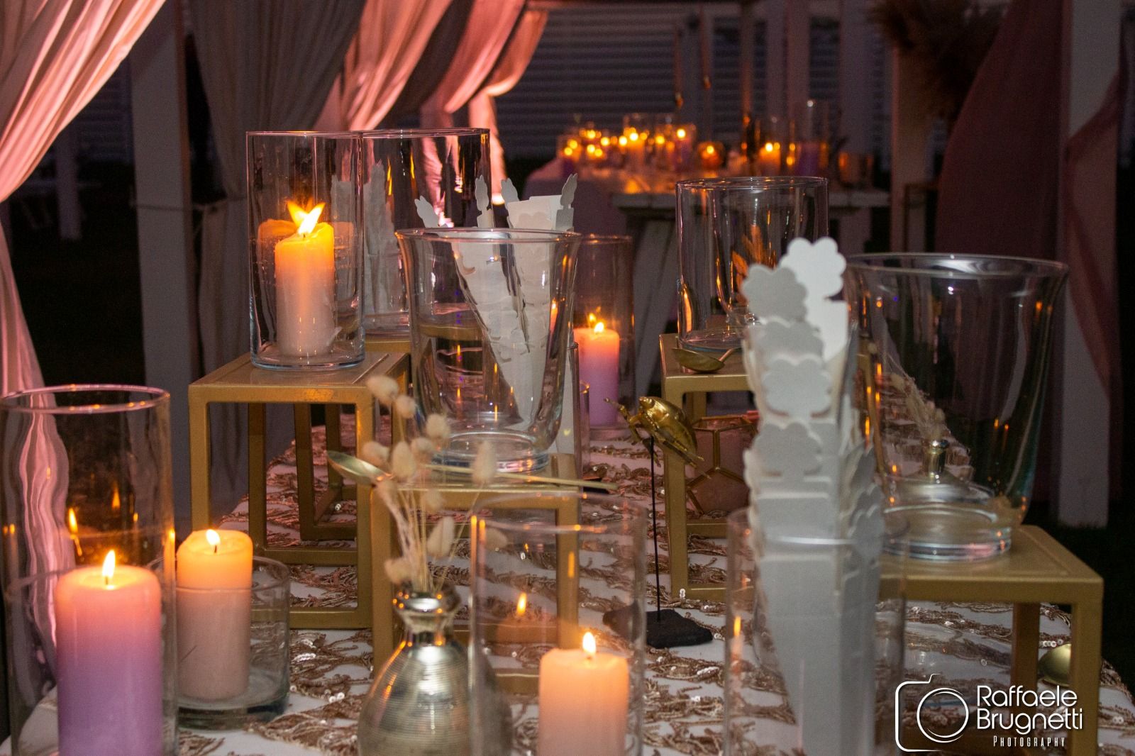 Un lato della spiaggia è stato illuminato d’improvviso, con trapezista che si dimenava su una mezza luna illuminata che rendeva il tutto davvero magico, il gazebo adibito ad altare celebrativo elegantemente vestito da drappò rosa e pampas color écru, statue alzate vasi color oro reggevano le grandi candele rosa, merito dell’architetto Wedding & Event designer Giulia Attardi.
