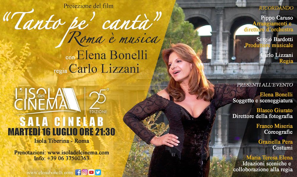 Questa sera alle ore 21:30 l’attrice e cantante Elena Bonelli, la voce di Roma, presenterà, ospite dell’Isola del Cinema all’Isola Tiberina, la speciale proiezione del film che la vede protagonista dal titolo “Tanto pe’ cantà – Roma è musica”.