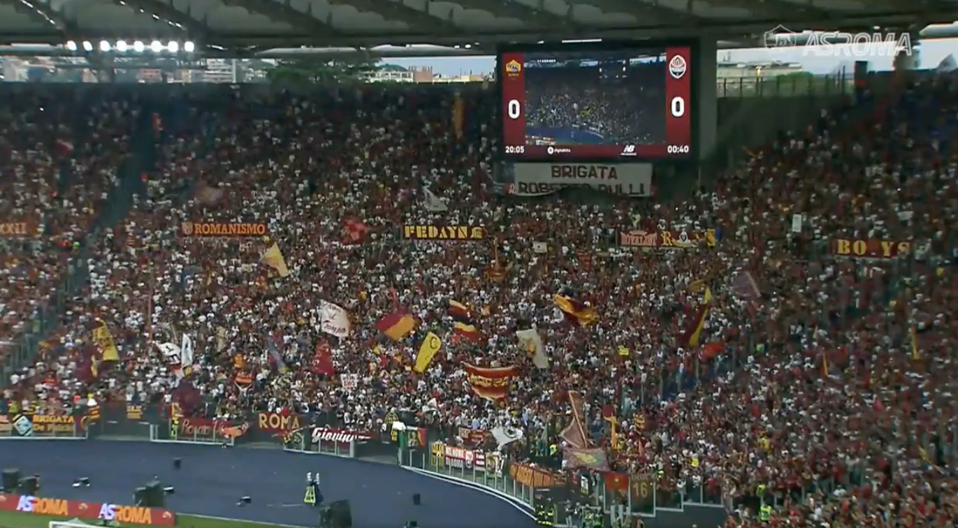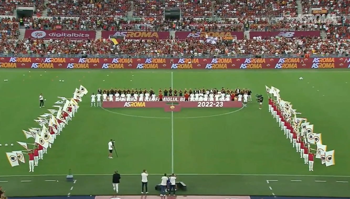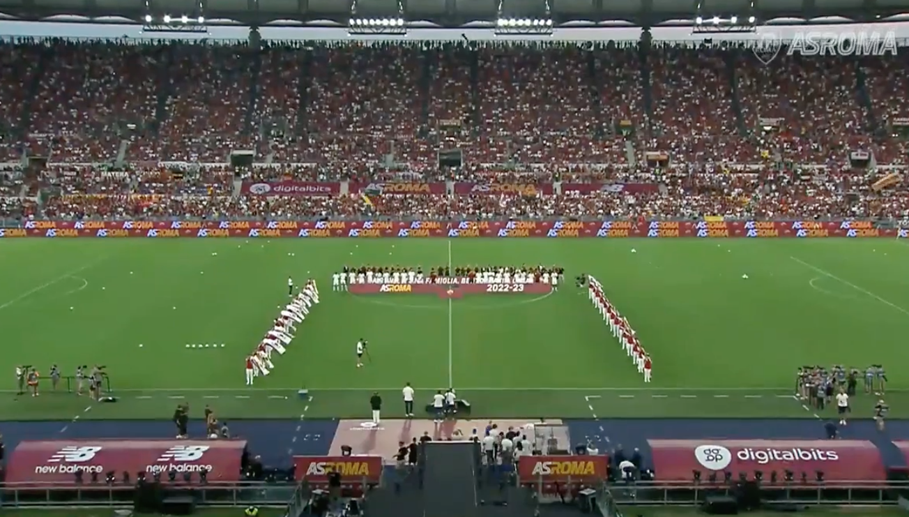 Migliaia di persone, incuranti del caldo, hanno riempito lo stadio, attendendo fuori già dal primo pomeriggio. E dentro la festa. Fuochi, musica, sbandieratori. Con José Mourinho e Lorenzo Pellegrini al centro degli onori.