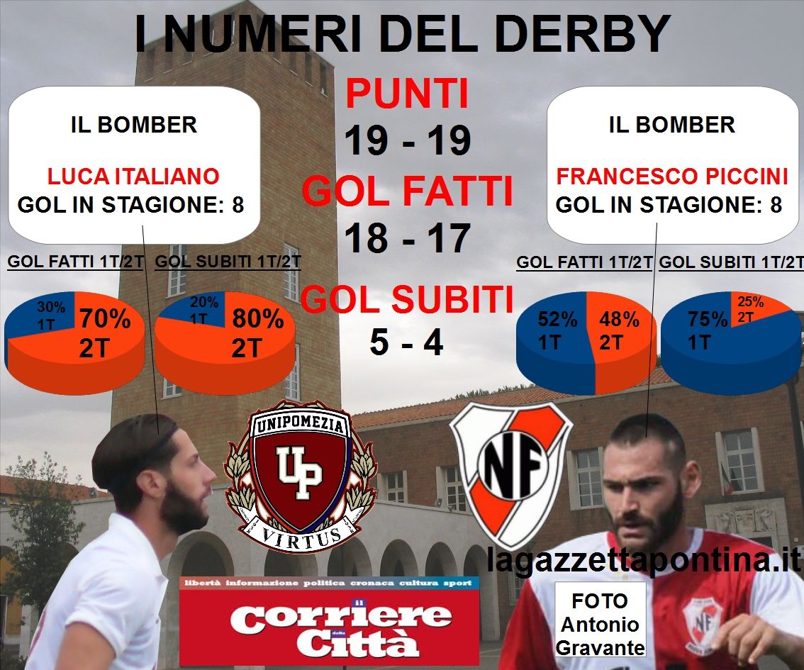 POMEZIA, 7 novembre 2015 – Il derby nel giorno del derby. Se Roma avrà occhi e orecchie soltanto per la “sua” stracittadina – Roma e Lazio si contenderanno i tre punti a partire dalle ore 15.00 – anche Pomezia (nel suo piccolo per carità!) si dividerà in due fazioni, per sostenere una delle due compagini che hanno maggiormente stupito in questo avvio di stagione in Promozione. Da una parte l’Unipomezia Virtus 1938, che arriva però al confronto con una clamorosa novità: in panchina non ci sarà il dimissionario Paolo Mazza (nelle dichiarazioni di entrambe le parti è emerso che si è venuta a creare una divergenza di vedute tra società e tecnico ndr), il quale ha guidato la squadra in queste prime sette giornate, bensì Francesco Mancini che avrà dunque il non facile compito di esordire in una partita così delicata; dall’altro lato del ring la Nuova Florida, sicuramente galvanizzata dall’aggancio alla rivale – avvenuto con incredibile puntualità proprio la settimana scorsa – e pronta ad effettuare il sorpasso dopo una rincorsa che dura fin dalla prima giornata. Ma chi parte, almeno sulla carta, favorito? Vediamo i numeri e le statistiche riguardanti le due formazioni.