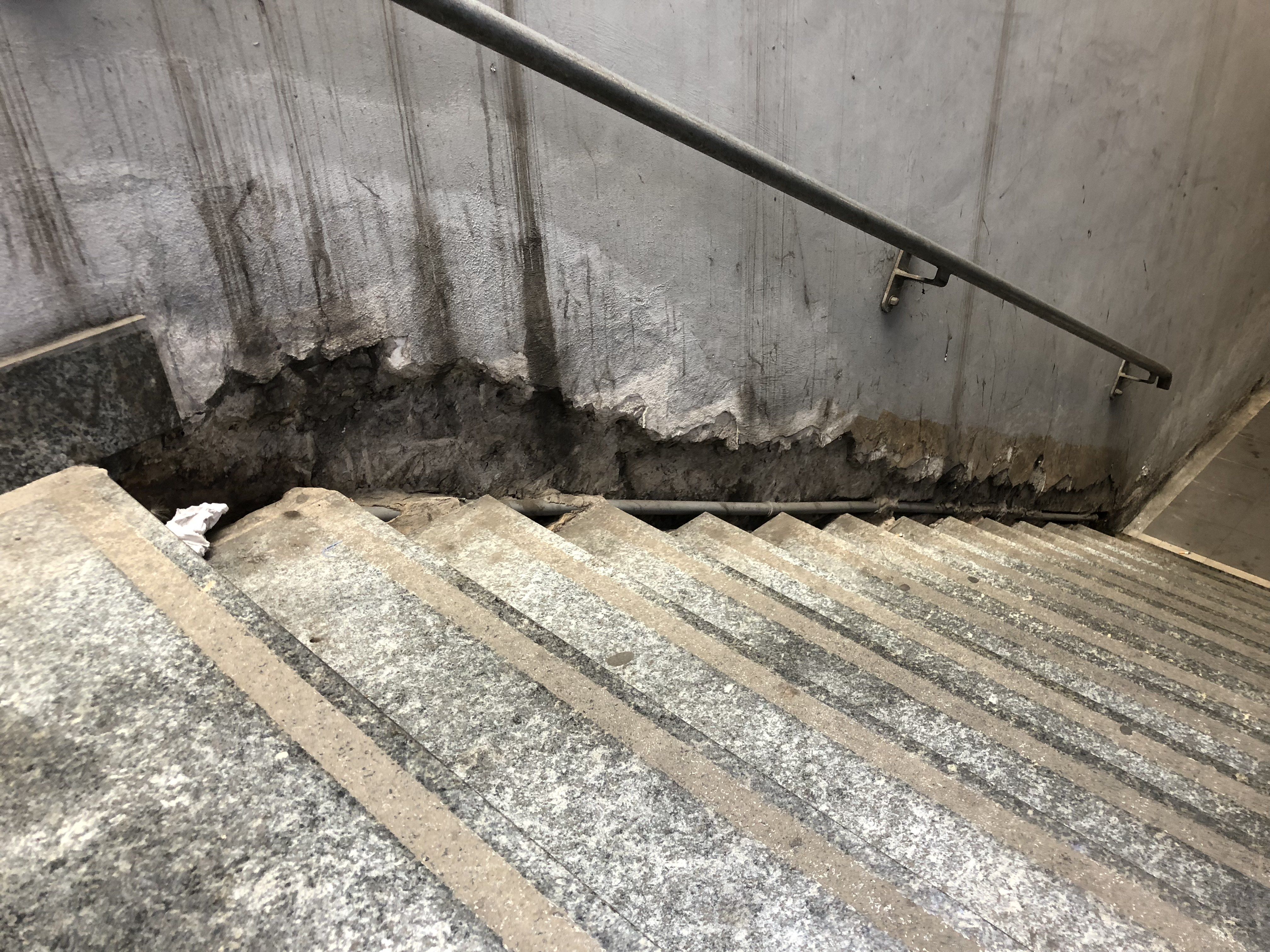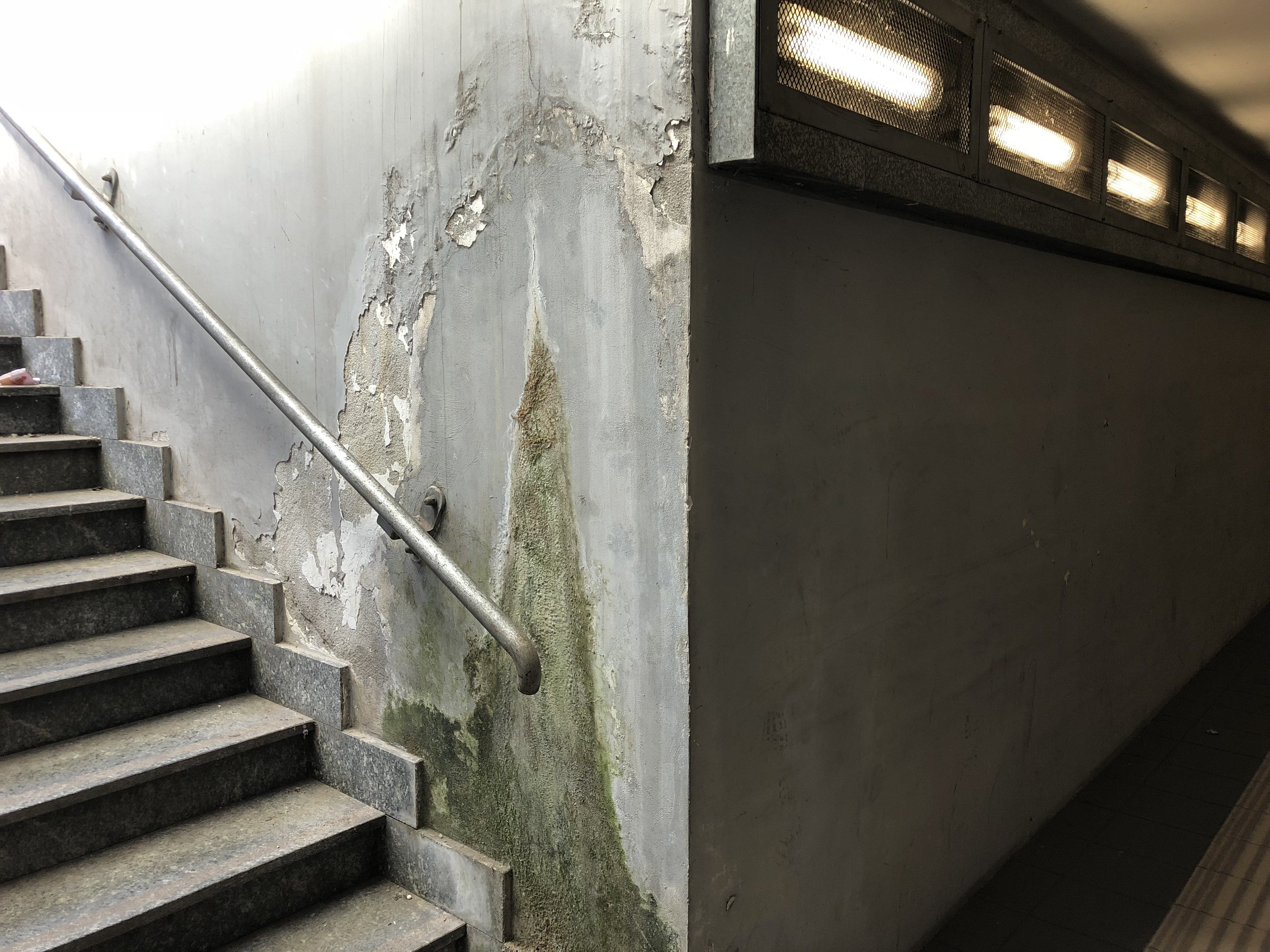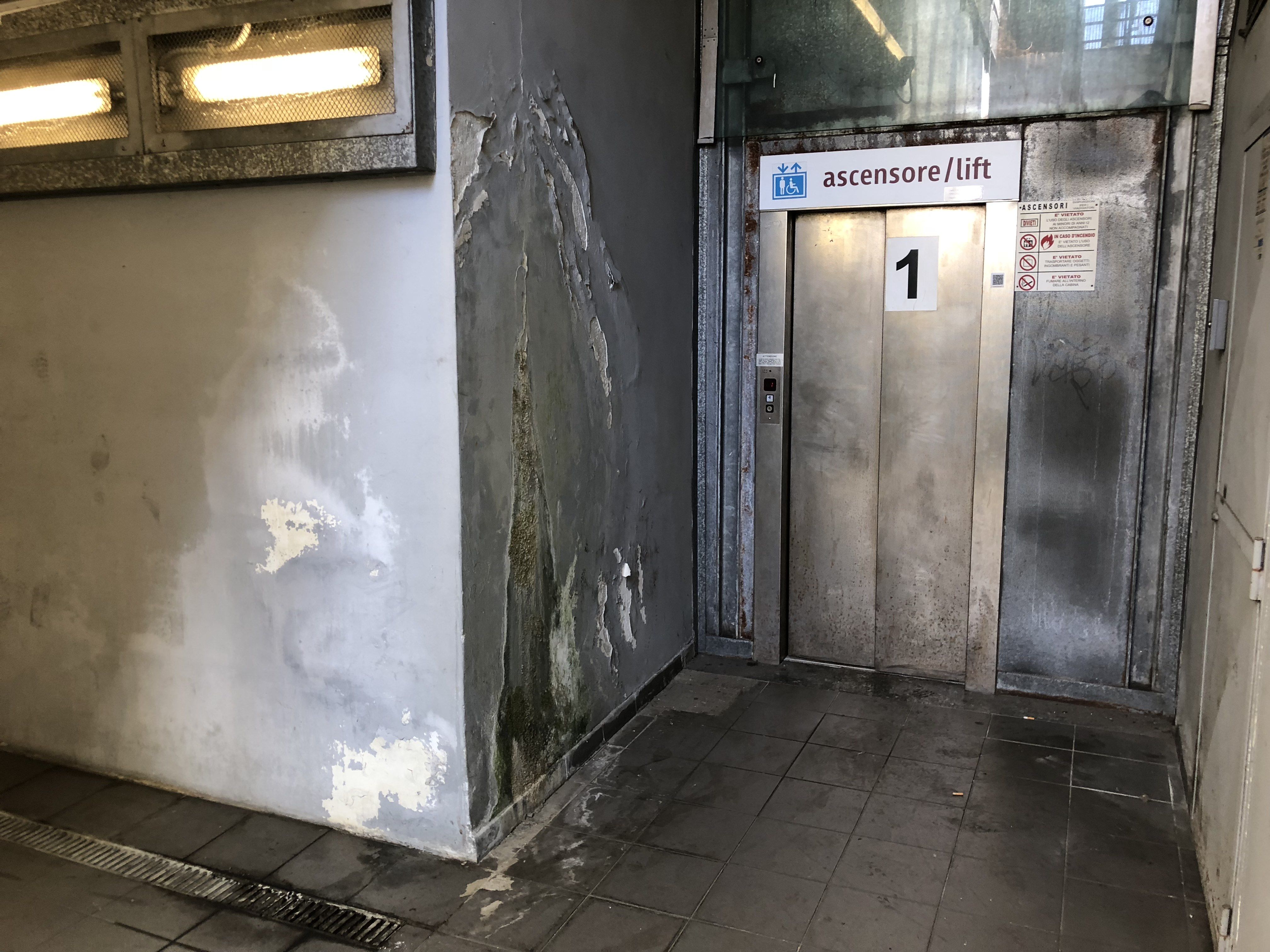 Ma il pezzo forte è il sottopasso che collega le due banchine. Un tunnel di pochi metri degno dei migliori film horror: nella penombra risaltano pezzi d’intonaco staccati dappertutto, crepe spaventose, infiltrazioni d’acqua che hanno ricoperto intere pareti, creando una quantità di muffa incredibile. E sulle scale che riportano in superficie , l’acqua che fuoriesce da tubature spezzate sta progressivamente erodendo il muro.
