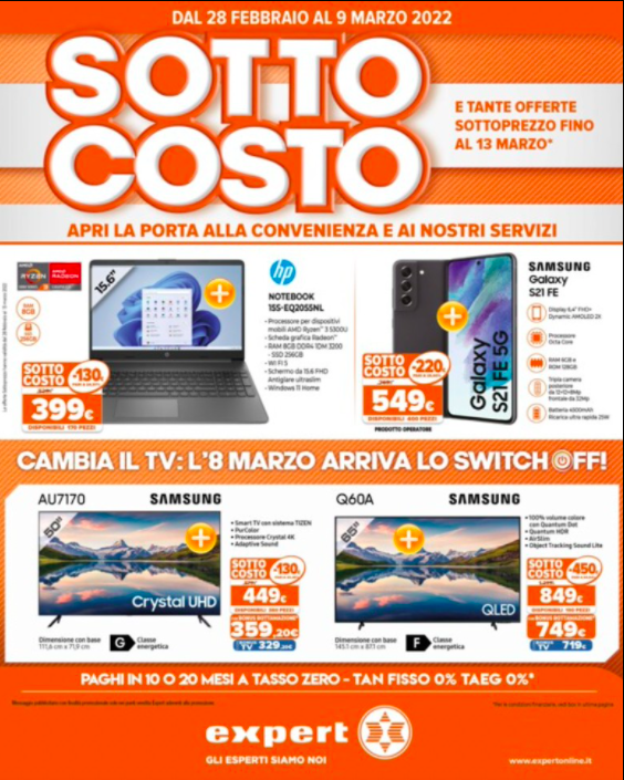 Offerte tech. Nell’aria c’è il dolce e soave profumo delle promozioni di marzo, degli sconti e delle nuovissime opportunità direttamente dal volantino Expert. Una stagione di sconti validi dal 28 febbraio sino al 9 marzo, in tutti i punti vendita della catena elettronica di consumo. Un volantino davvero ricco e succulento, all’interno del quale troverete tantissime opportunità di risparmio per tutto il mondo della tecnologia smart, come cellulari di ultima generazione, piccoli e grandi elettrodomestici, Tv e molto altro ancora.
