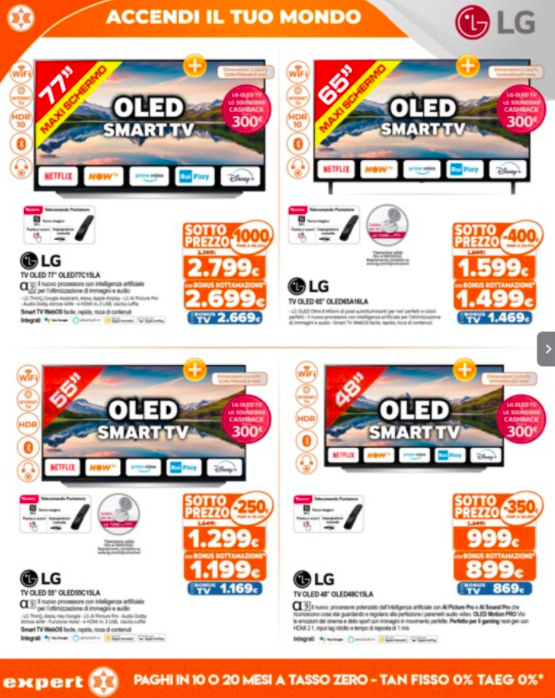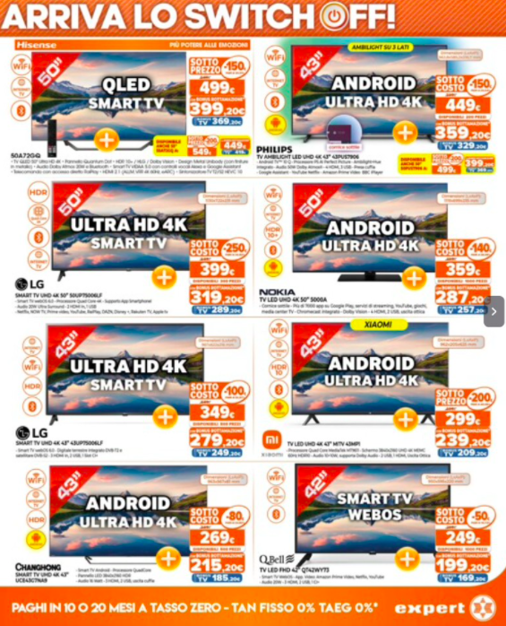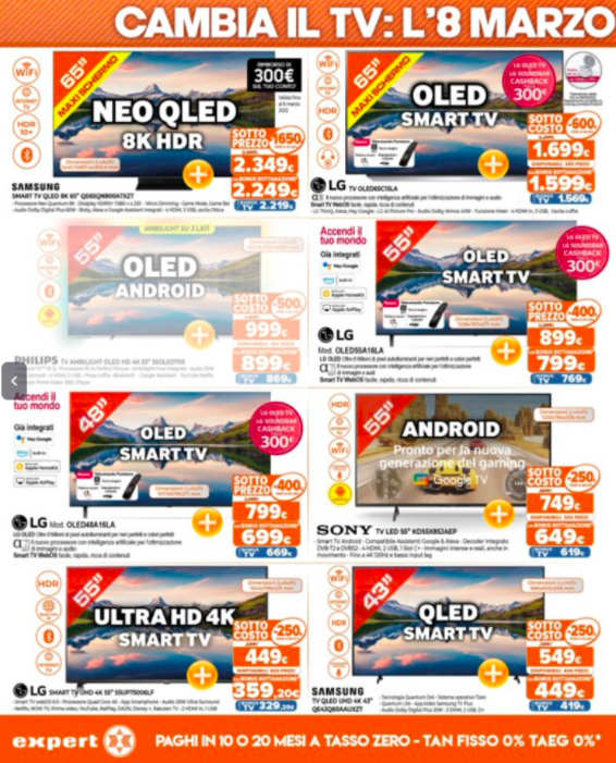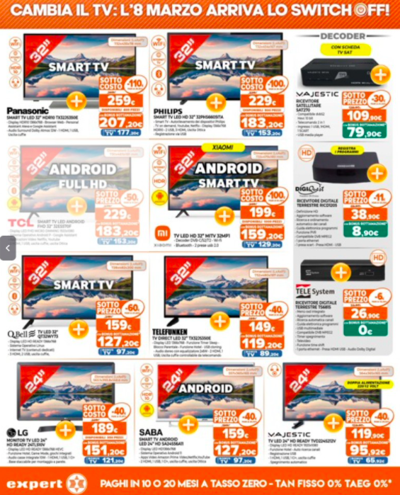 Dunque, a breve dovremo tutti munirci di dispositivi con tuner DVB-T2, cioè un decoder integrato o aggiungere un decoder esterno TV adattato. In altre parole, questa potrebbe essere un’ottima occasione per poter acquistare un nuovo dispositivo in vista di questi imminenti cambiamenti, cercando di risparmiare qualcosa sul prezzo finale. Di seguito, troverete il nuovo volantino Expert dedicato a tutte le offerte tecnologiche di questo periodo.