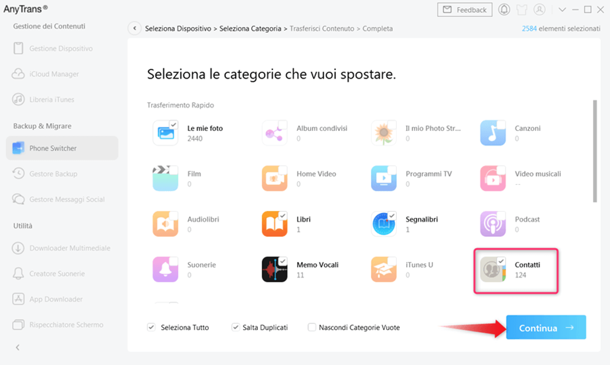 4. Ora, seleziona il tipo di file che desideri trasferire e fai clic su “Continua” sulla freccia destra. È possibile trasferire musica, film, foto, messaggi, suonerie, registri delle chiamate, libri e calendari ecc.