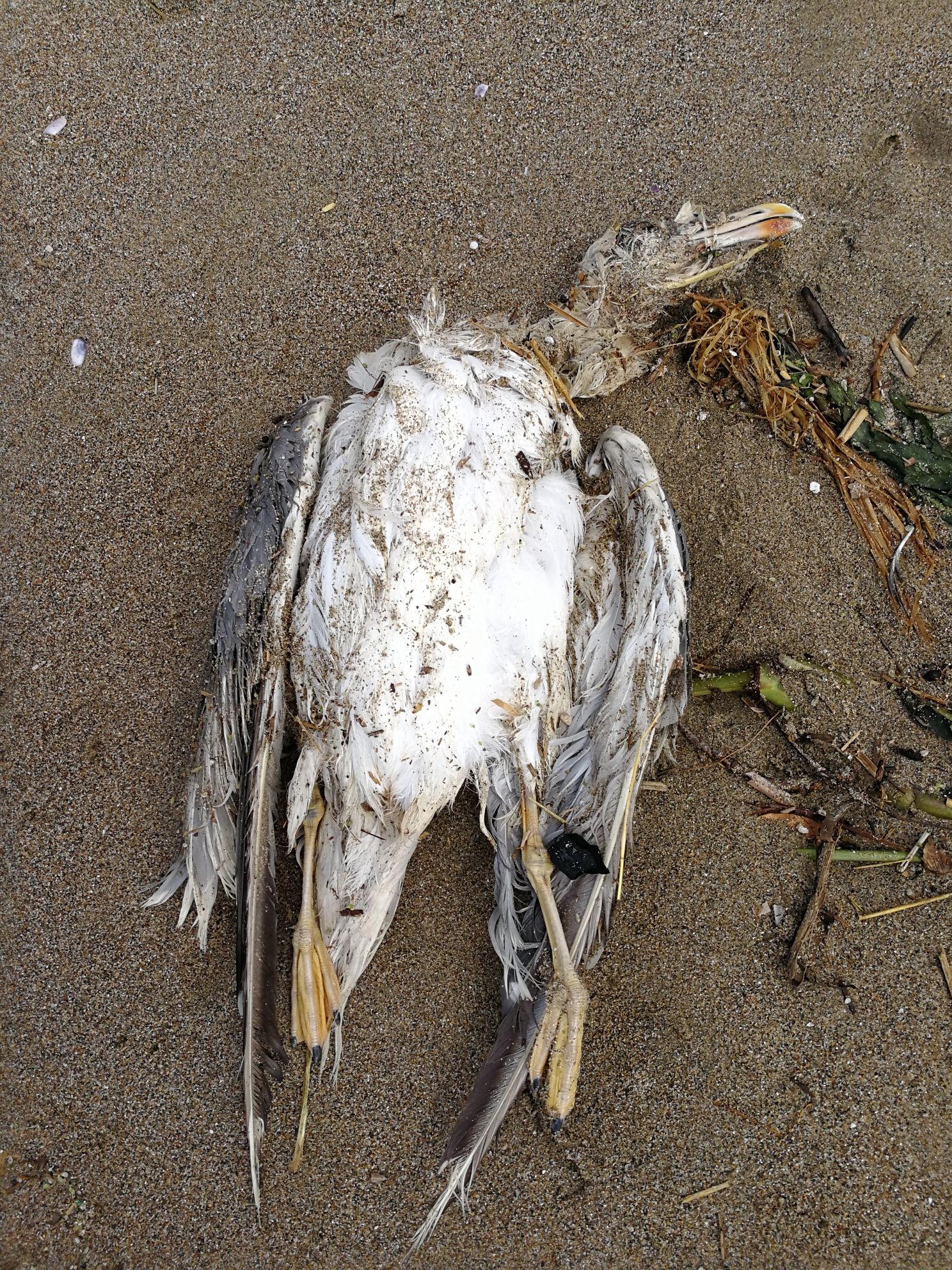 gabbiano morto ritrovato sulla spiaggia all’altezza del punto di soccorso comunale di Pomezia n. 14.