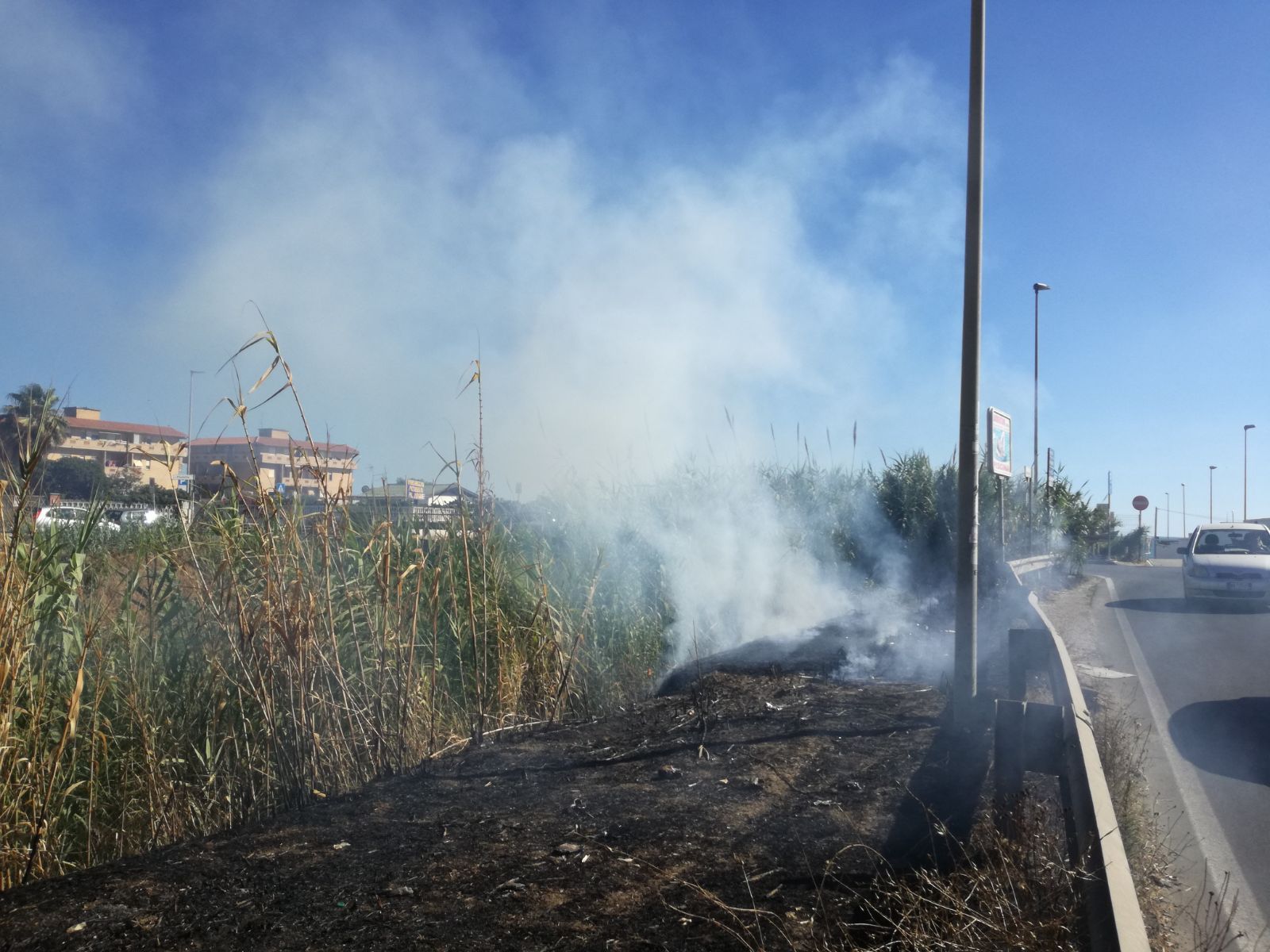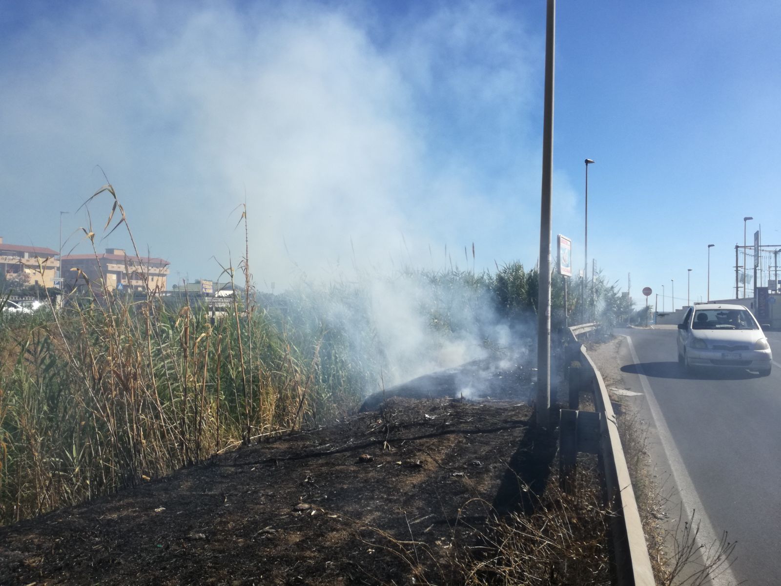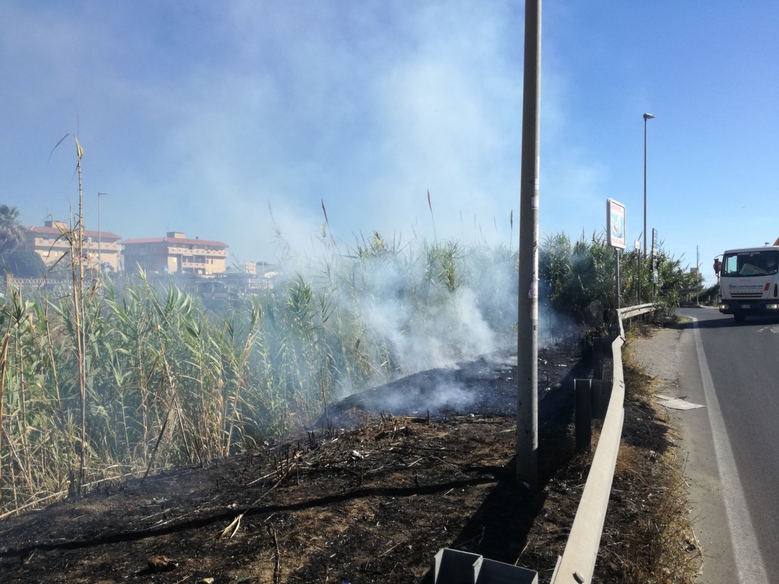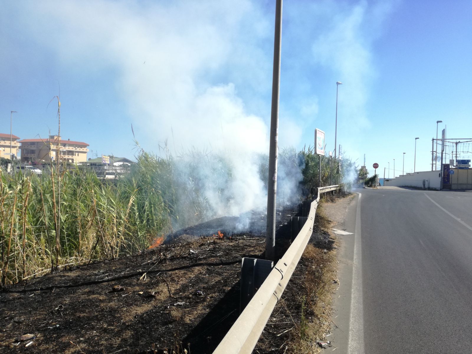 Le fiamme hanno coinvolto la vegetazione che delimita il canale. Al momento della pubblicazione non erano ancora intervenute le forze dell’ordine. Il fumo ha rapidamente invaso la strada e si sta spingendo verso il mare.