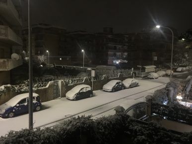 Neve abbondante anche all’interno, con strade, piazze, alberi, auto ricoperti di neve, mentre i fiocchi continuano a cadere copiosi.