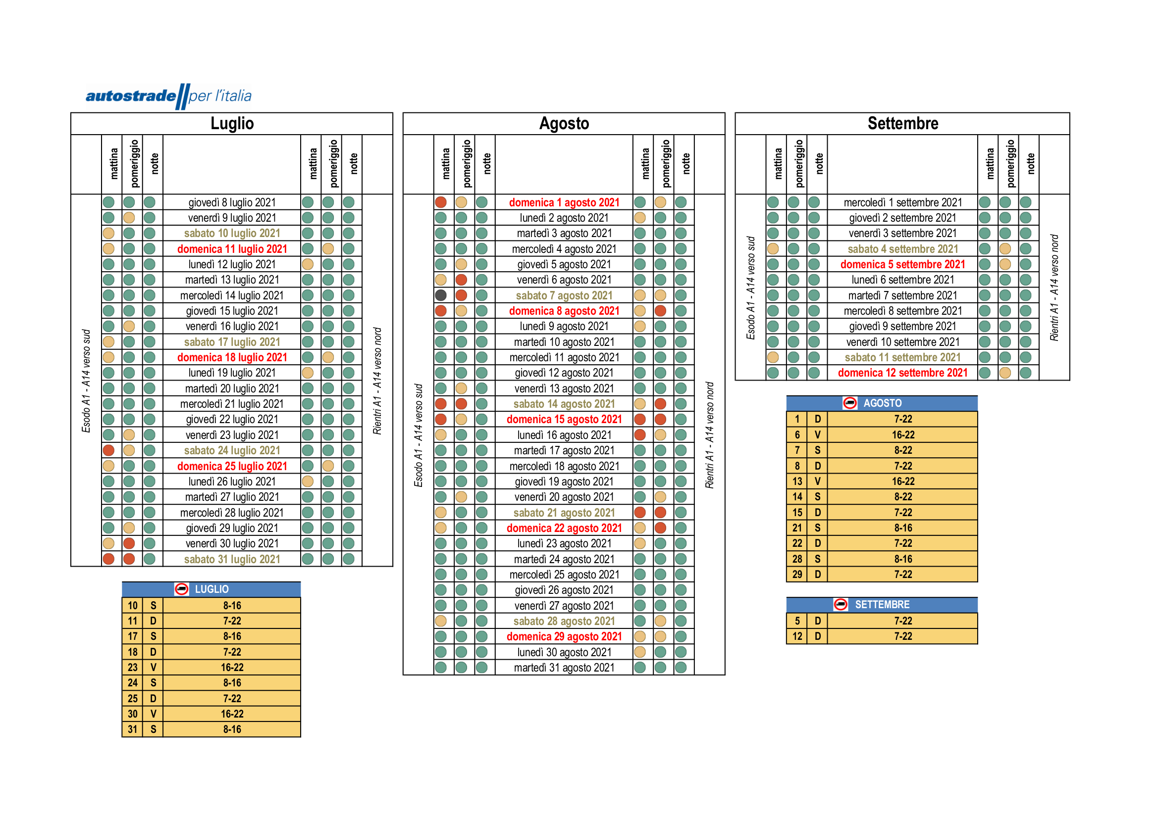 – Le giornate critiche per traffico intenso sulle autostrade;