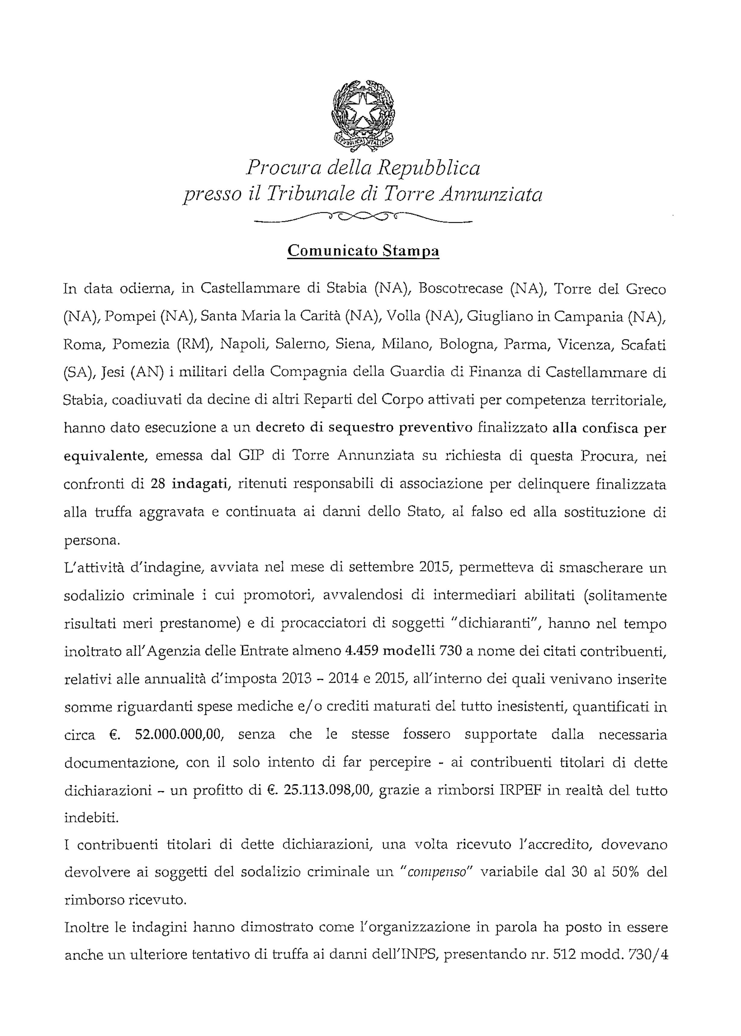 I finanzieri della Compagnia di Castellammare di Stabia hanno dato esecuzione ad un decreto di sequestro preventivo finalizzato alla confisca per equivalente di beni sino alla concorrenza di euro 25.113.098,00, emesso dal GIP di Torre Annunziata, nei confronti di 28 indagati ritenuti responsabili di associazione per delinquere finalizzata alla truffa aggravata e continuata ai danni dello Stato, al falso ed alla sostituzione di persona. I sequestri sono stati eseguiti in 18 città sparse in tutta Italia, tra le quali anche Pomezia.