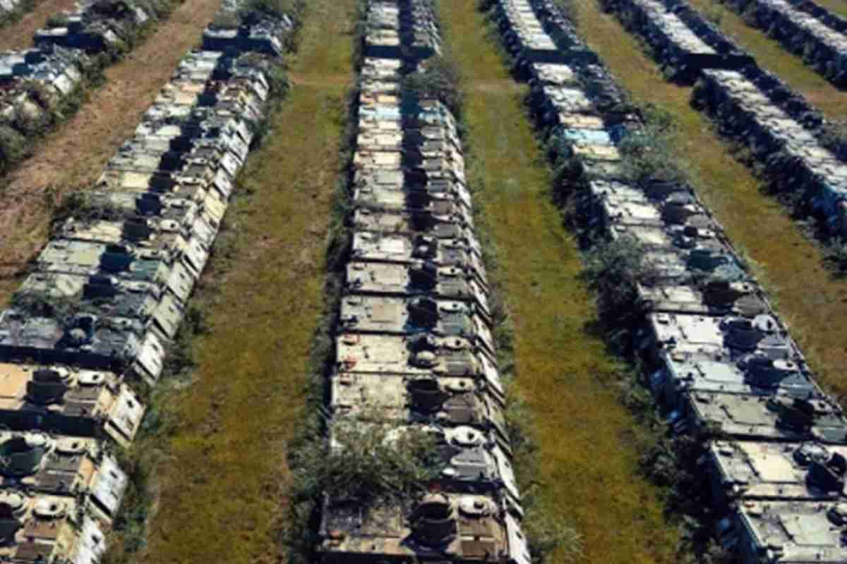 Ad esempio parte dei veicoli sembrerebbe sia stata inviata recentemente, una volta rimessi in condizioni ottimali, in Ucraina. Oppure venduti ad altri Paesi. Al momento della redazione di questo articolo si stima pertanto che il numero di mezzi contenuti in questo terreno sia sceso attorno alle 3.000 unità ma come detto in passato ce ne sono stati molti di più. Leopard, M-109, autoblindo Centauro, cingolati, questi alcuni degli identificativi dei mezzi presenti. Di questi la maggior parte è ciò che resta degli anni della Guerra Fredda ma comunque ce ne sono altri più recenti. In ogni caso, al netto di tutto, l’area resta comunque un vero e proprio cimitero: veicoli ormai fuori uso sistemati uno accanto all’altro e ricoperti in diversi casi dalla vegetazione.