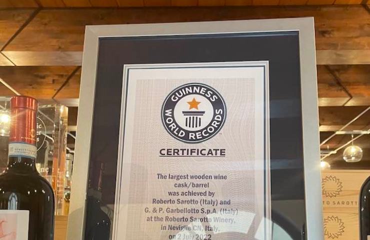 Il primato mondiale spetta all’azienda agricola Roberto Sarotto. La cerimonia ufficiale con la consegna della classica targa – ormai un must grazie al programma in onda in prima serata su Canale 5 condotto da Jerry Scotti – si è svolta nel luglio 2022. Questa grande botte, che i proprietari hanno dedicato ai genitori e fondatori della cantina più di 70 anni fa, custodisce la Riserva di Barolo dell’annata 2016 la cui vendita è stata destinata ad uno scopo sociale.