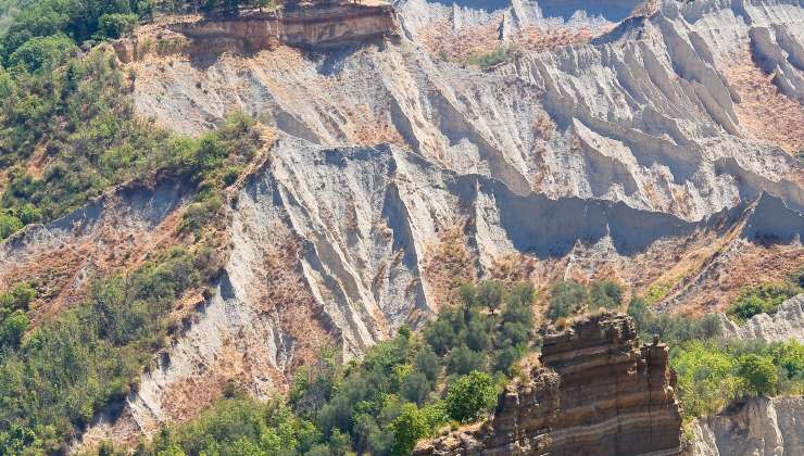 Ma cosa sono i calanchi e perché si chiamano così? I calanchi come detto sono delle conformazioni specifiche rocciose create da vento e pioggia. Il paesaggio regala scorci mozzafiato anche in virtù della diversa illuminazione che si può ammirare a seconda del momento della giornata, con particolare predilezione per il tramonto ovviamente; osservando la valle dalla rupe su cui pioggia Civita di Bagnoregio, conosciuta nel mondo come “la città che muore” e inserita nell’elenco dei borghi più belli d’Italia e del Lazio, è possibile notare le diverse stratificazioni geologiche che formano complessivamente quelli che sembrano a tutti gli effetti come tagli e ferite nella roccia.